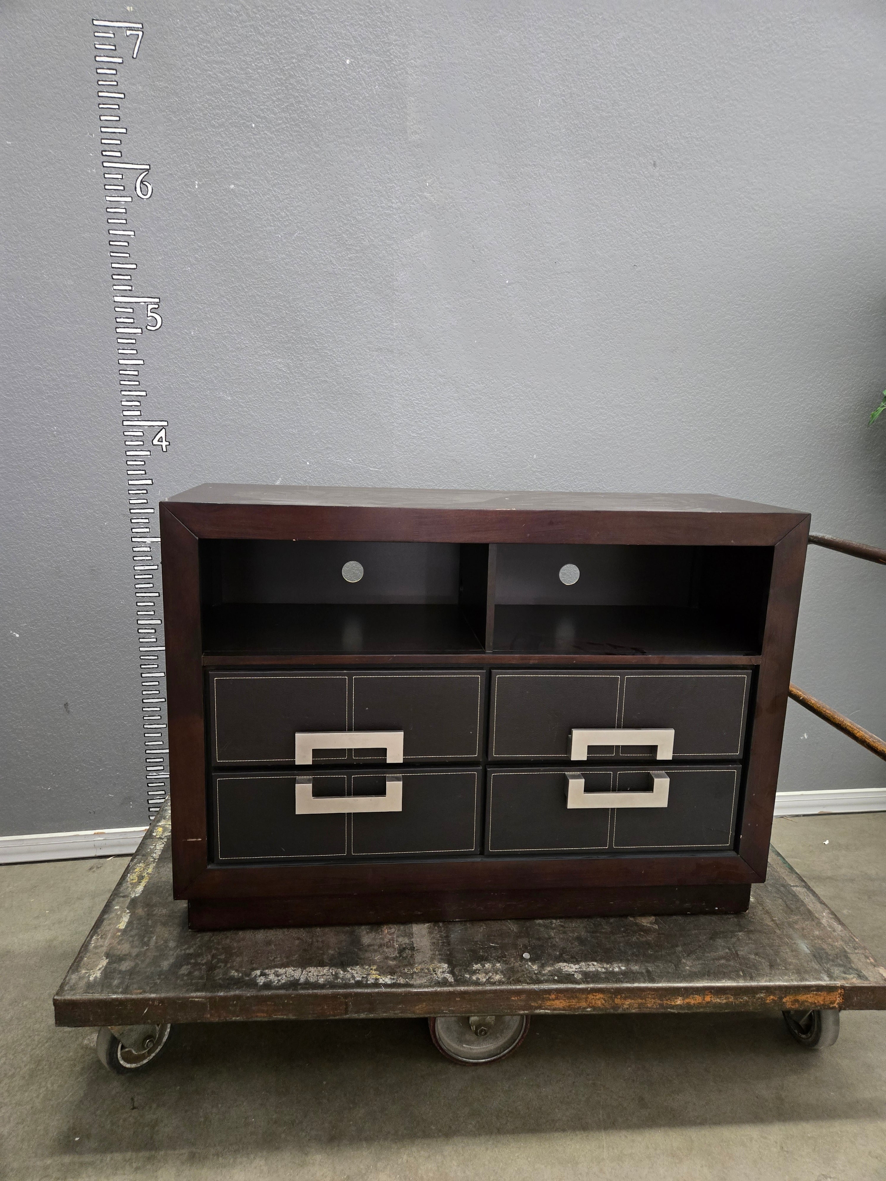 This elegant media console features a rich dark wood finish with a smooth texture. It includes two open shelves and four drawers with modern metal handles, perfect for organizing media accessories. Approximate Size: 3 x 4 x 1.5
