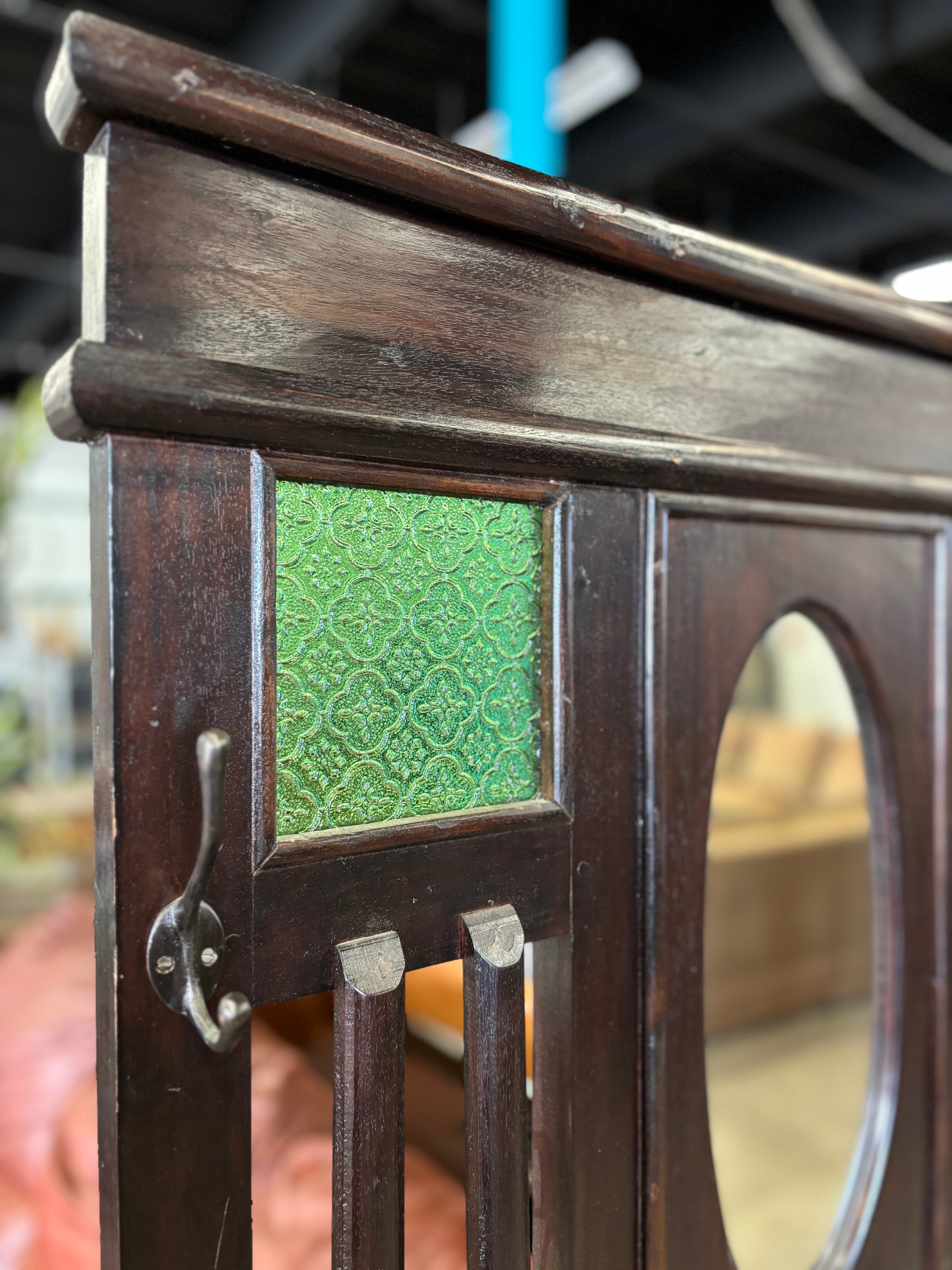 This elegant hallway stand features a rich dark wood finish, complemented by a distinctive oval mirror and functional drawer. The stand includes decorative green fabric panels, adding a unique and classic aesthetic to your foyer. Approximate Size: 6 x 2 x 1