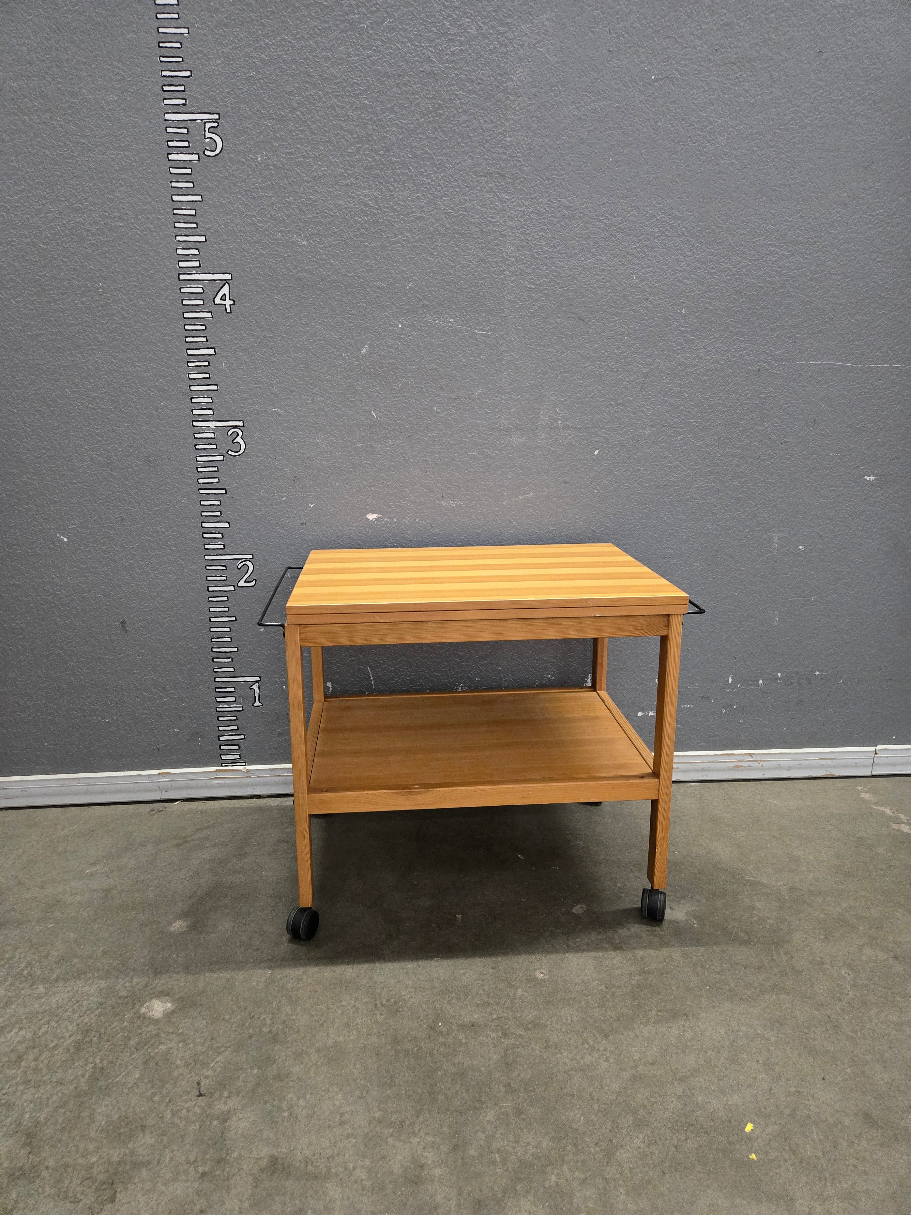 This practical utility cart features a natural wooden finish with a smooth surface. It comes with a spacious top and an additional lower shelf, perfect for storage and organization. Approximate Size: 2.5 x 2 x 1.5