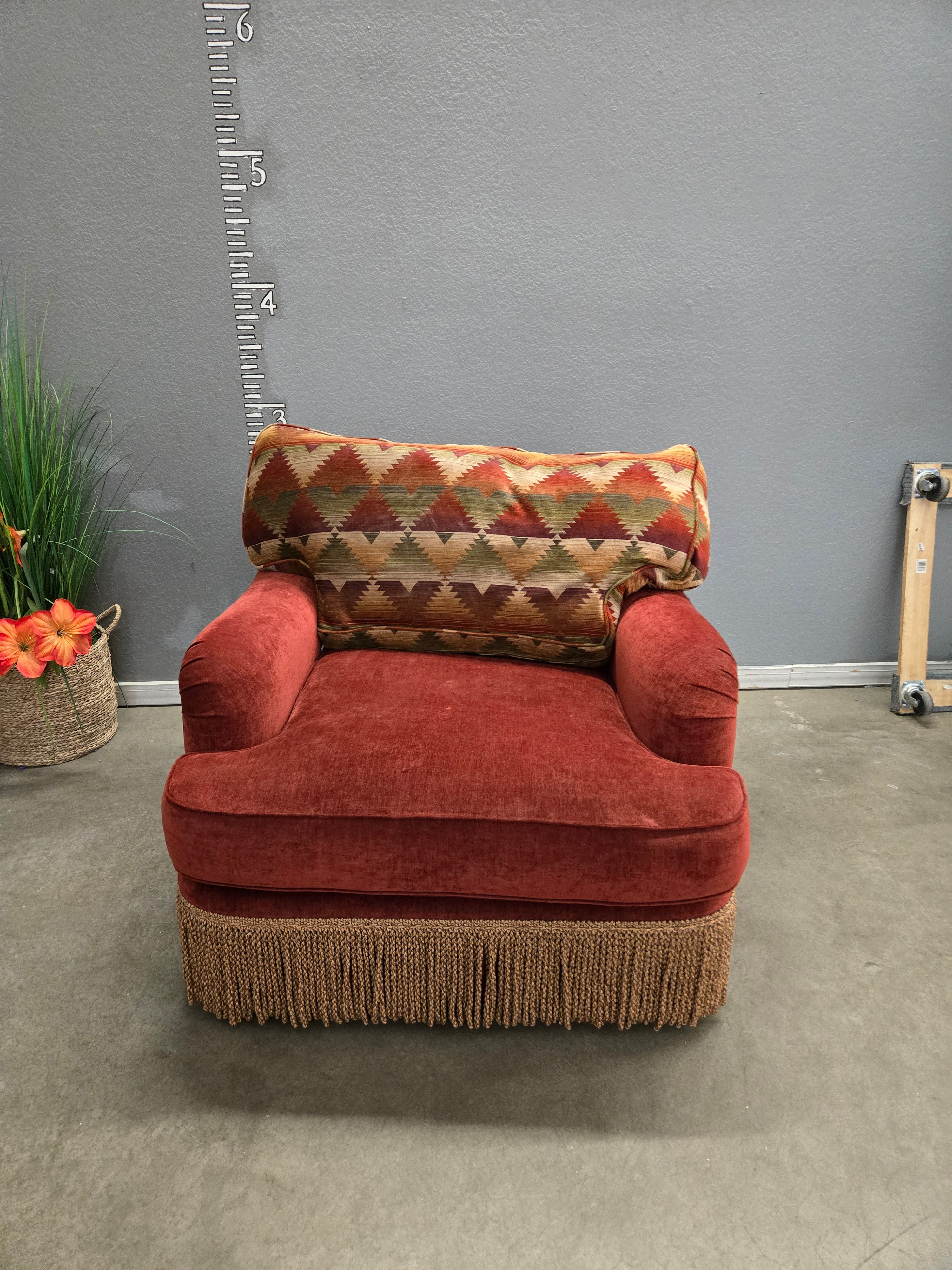 This cozy armchair features a vibrant red fabric with a plush, textured finish accented by a decorative fringe at the base. The back cushion offers a unique geometric pattern with earthy tones of brown and orange, adding a touch of bohemian flair. Approximate Size: 3 x 3.5 x 3