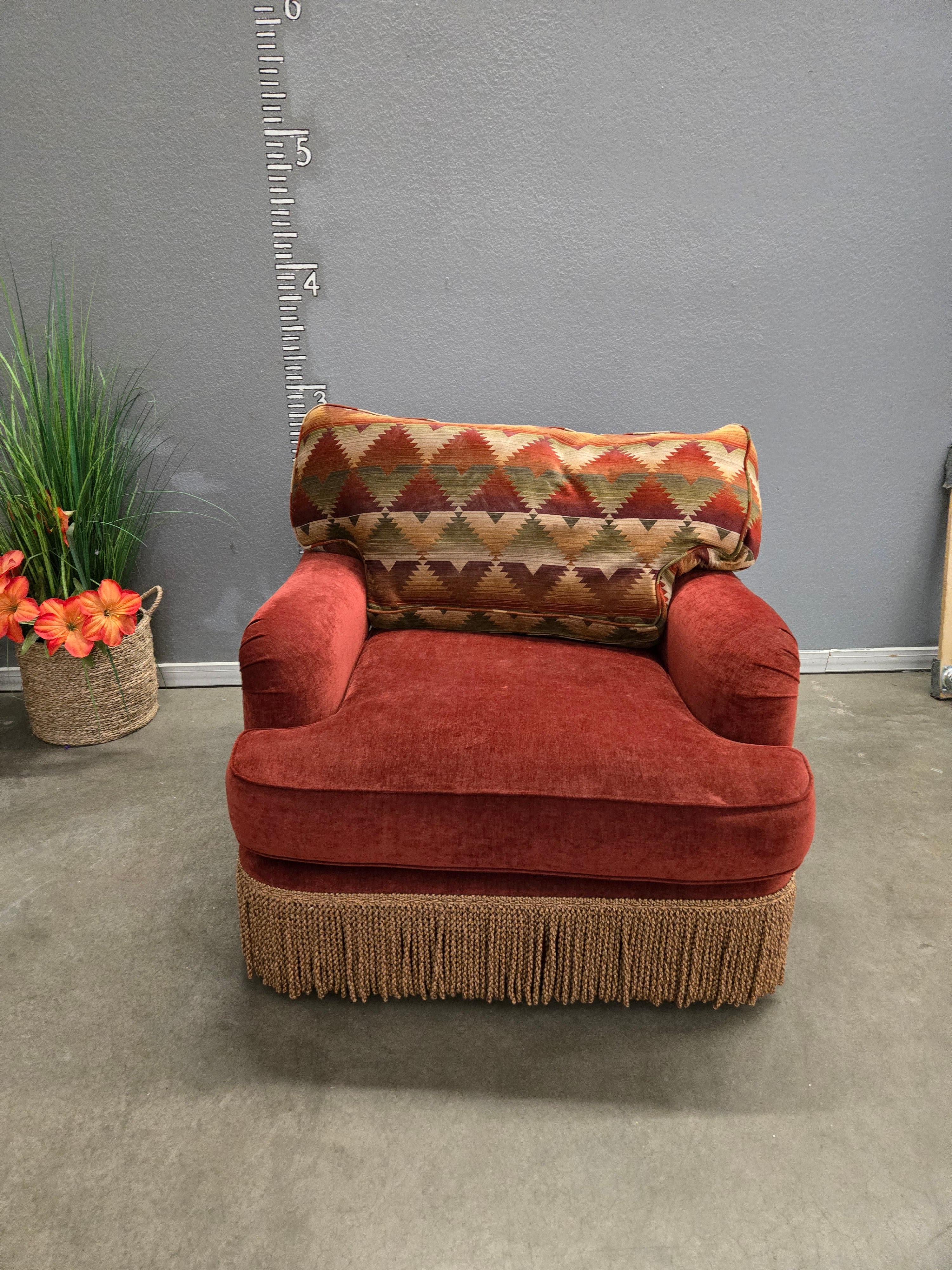 This plush armchair features a rich red velvet fabric with a warm, earthy pattern on the cushion. The chair is accented by a stylish fringe at the base, offering both comfort and a touch of retro elegance. Approximate Size: 3 x 3 x 3