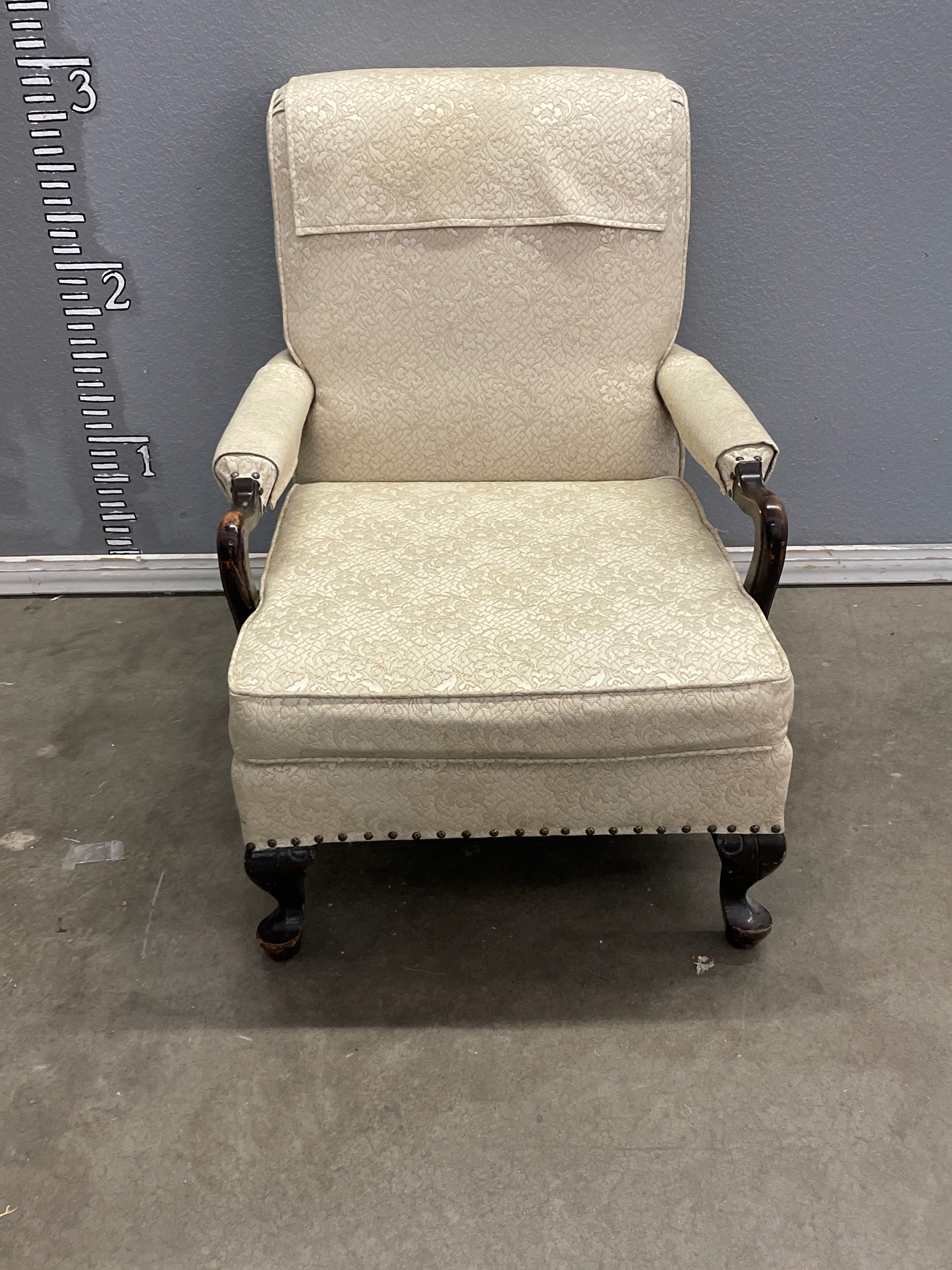A vintage armchair featuring a cream-colored fabric with a subtle floral pattern and a soft, cushioned seat. The chair has elegant wooden legs with a natural finish, perfect for adding a classic touch to any living space. Approximate Size: 3 x 2.5 x 3