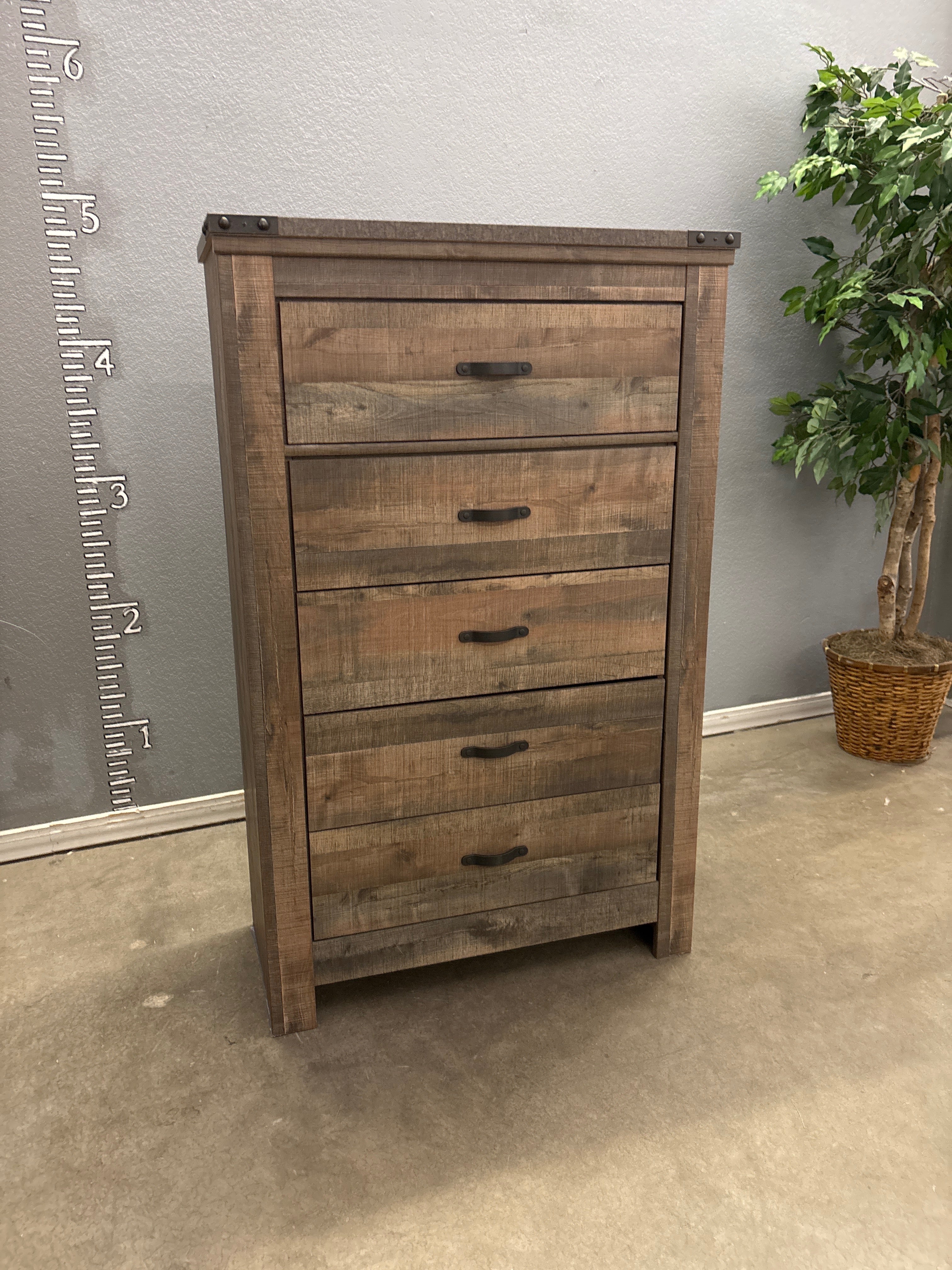 This charming rustic chest is crafted in a weathered brown wood finish, offering ample storage space with its five drawers. The design features a sturdy build with black metal hardware, perfect for a cozy bedroom setting. Approximate Size: 4.5 x 2.5 x 1.5