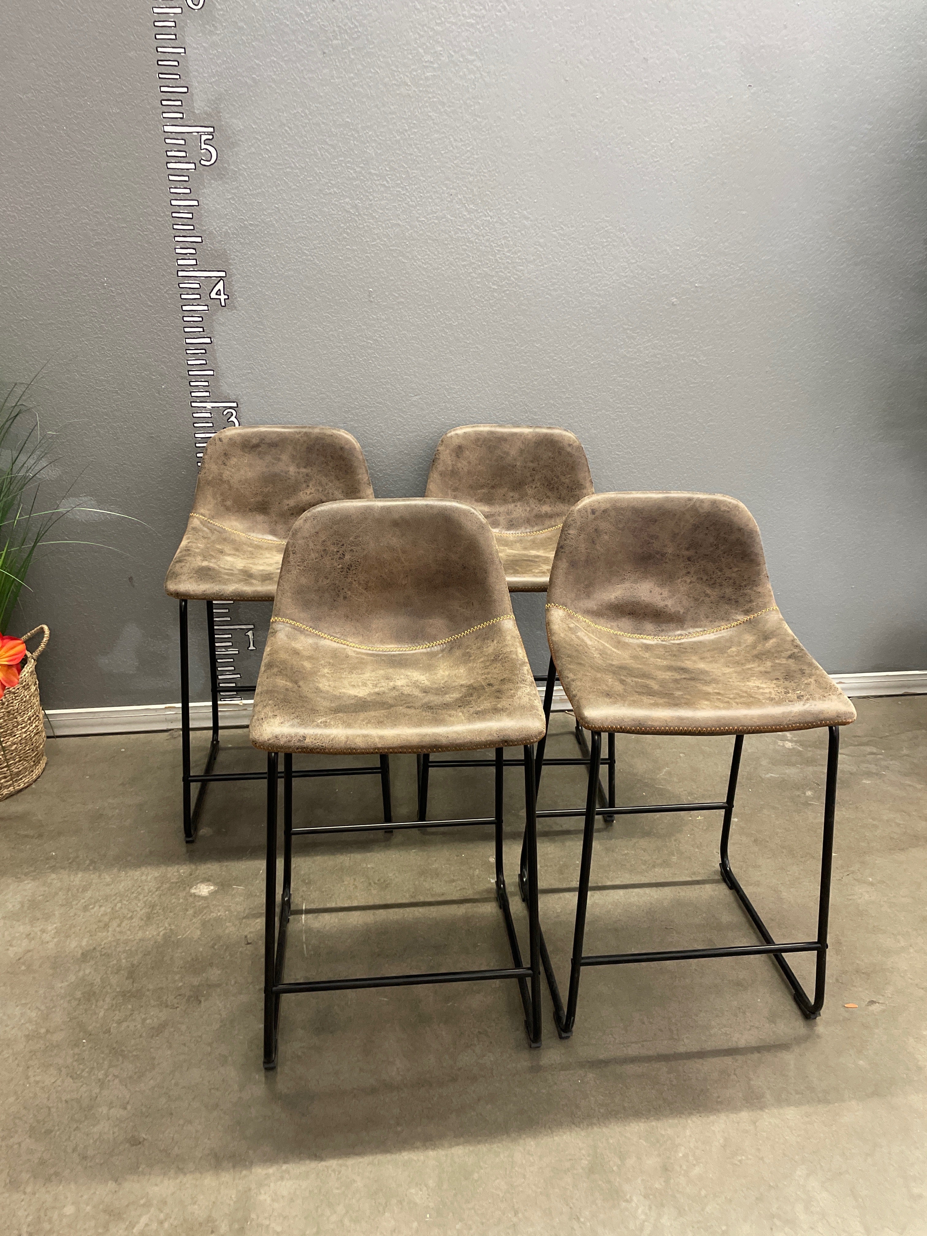 Set of four rustic bar stools featuring a distressed brown leather finish and sturdy black metal legs. Ideal for adding a touch of industrial charm to your space. Approximate Size: 3 x 1.5 x 1.5