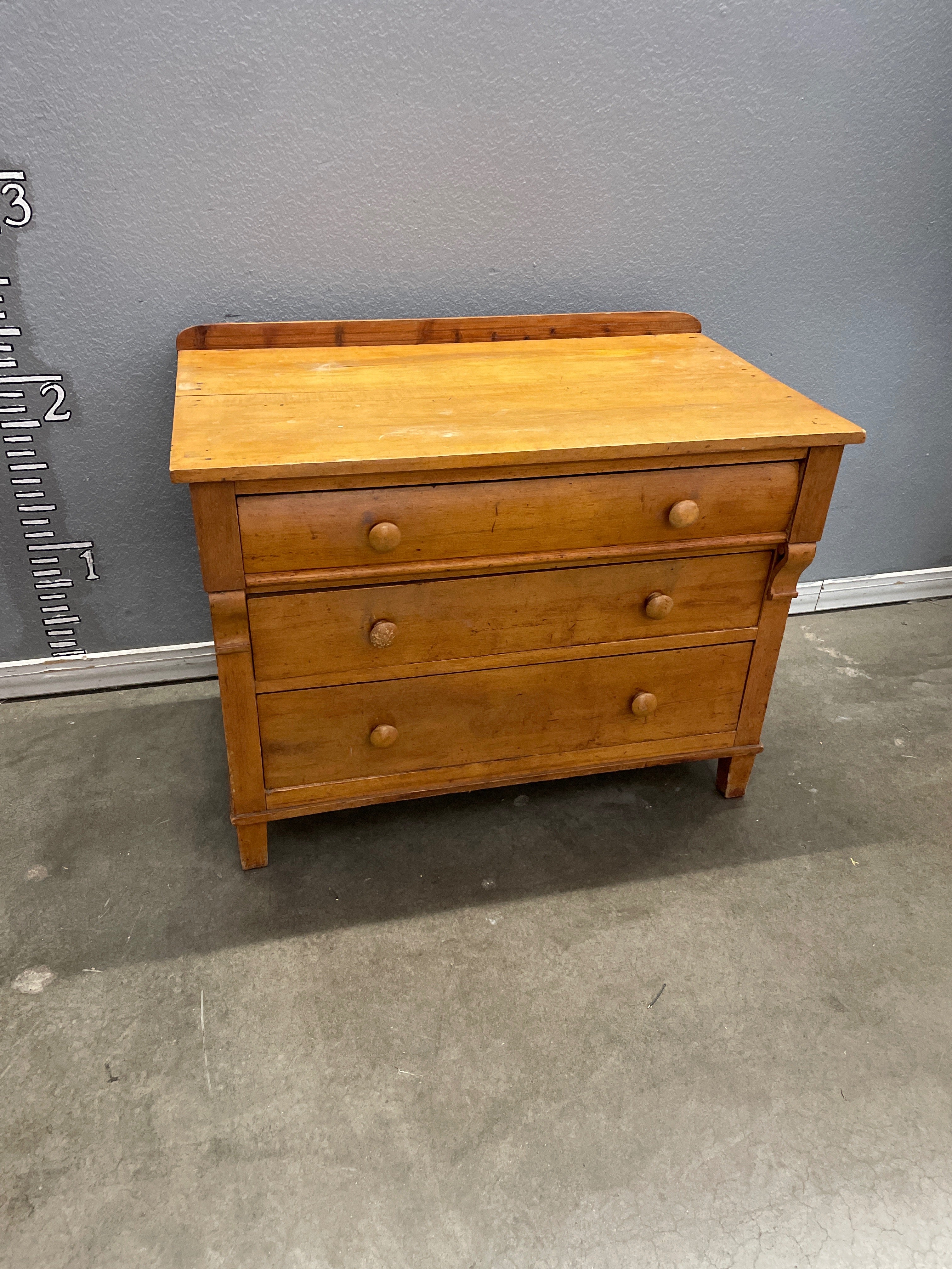 This charming dresser features a warm honey-colored finish with a smooth, polished surface. It has three spacious drawers with round wooden knobs, perfect for organizing clothing or household items. Approximate Size: 2.5 x 3 x 1.5