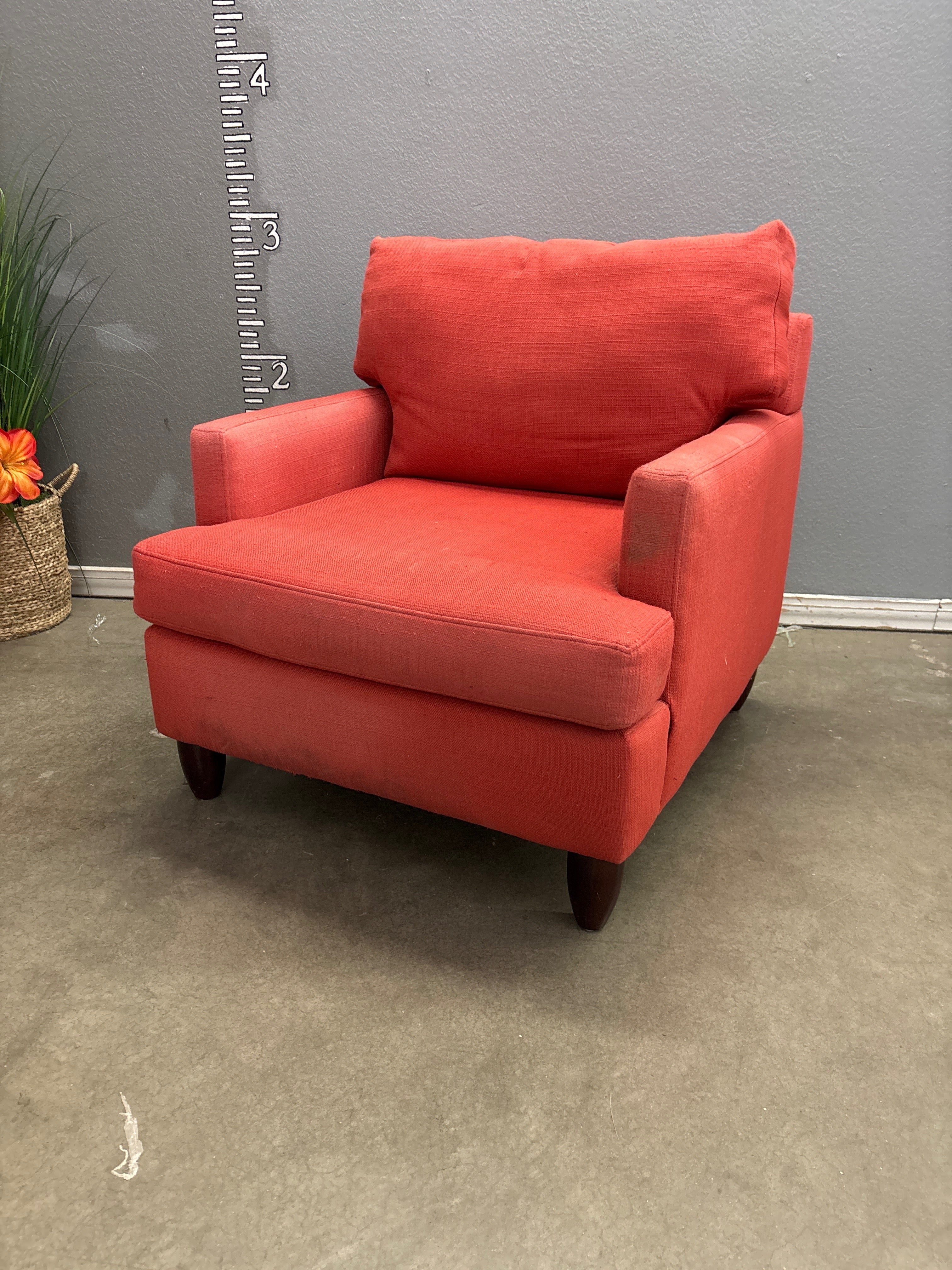 A vibrant red armchair featuring a soft fabric upholstery with a matte finish. Perfect for adding a pop of color to your living room. Approximate Size: 3 x 3 x 3