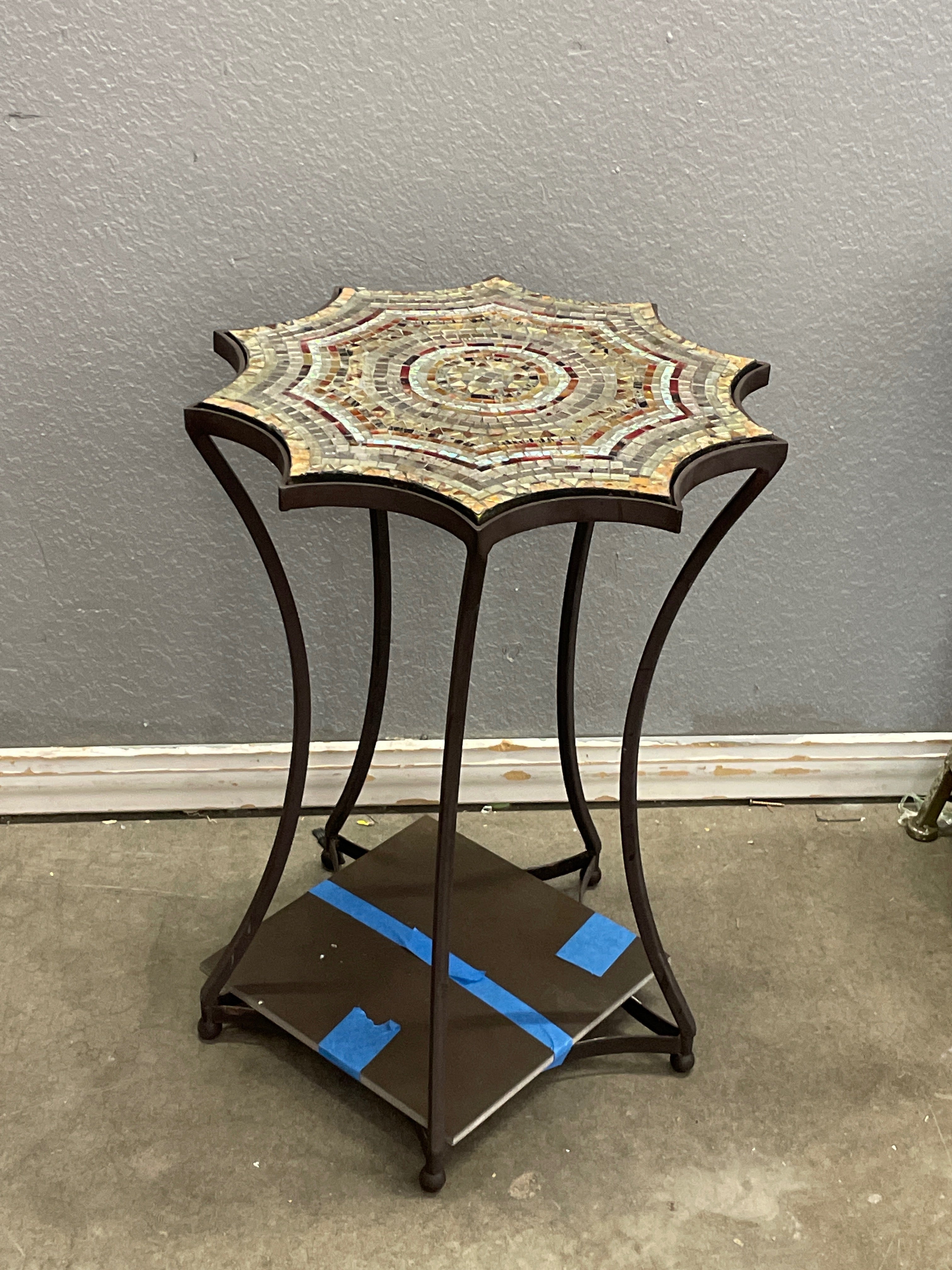 This elegant side table features a beautifully crafted mosaic top in an array of earth tones, with a polished metal frame in a bronze finish. The intricate design adds a touch of artistic flair, making it a perfect accent piece. Approximate Size: 2.5 x 1.5 x 1.5