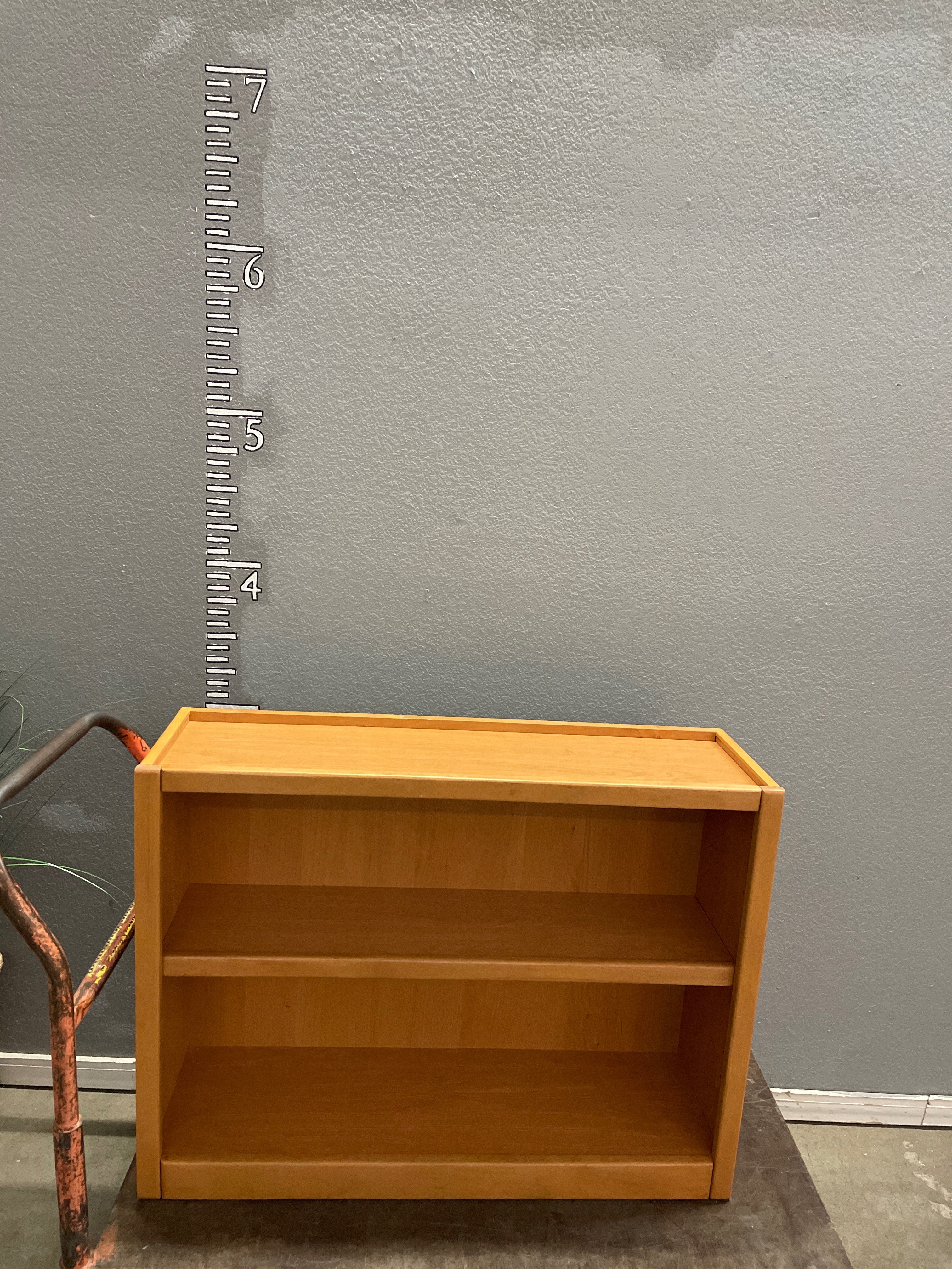 This bookshelf features a sleek natural wood finish, perfect for any space. Its compact design includes two shelves, offering ample storage for books or decorative pieces. Approximate Size: 3 x 3 x 1