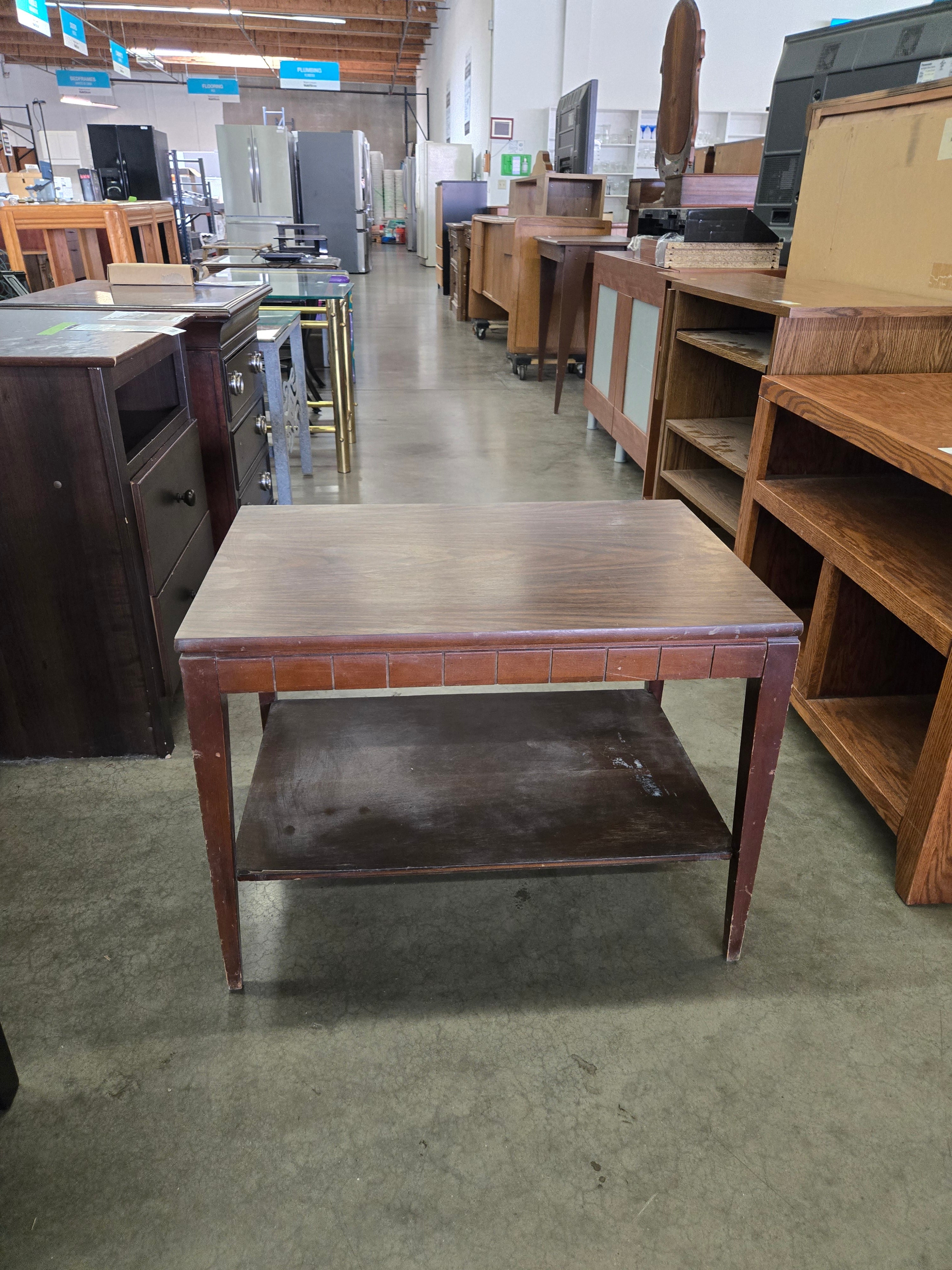 This charming vintage side table features a rich brown finish and a practical lower shelf, perfect for additional storage. Made from sturdy wood, it offers a classic look that fits seamlessly into any room. Approximate Size: 2 x 3 x 1.5