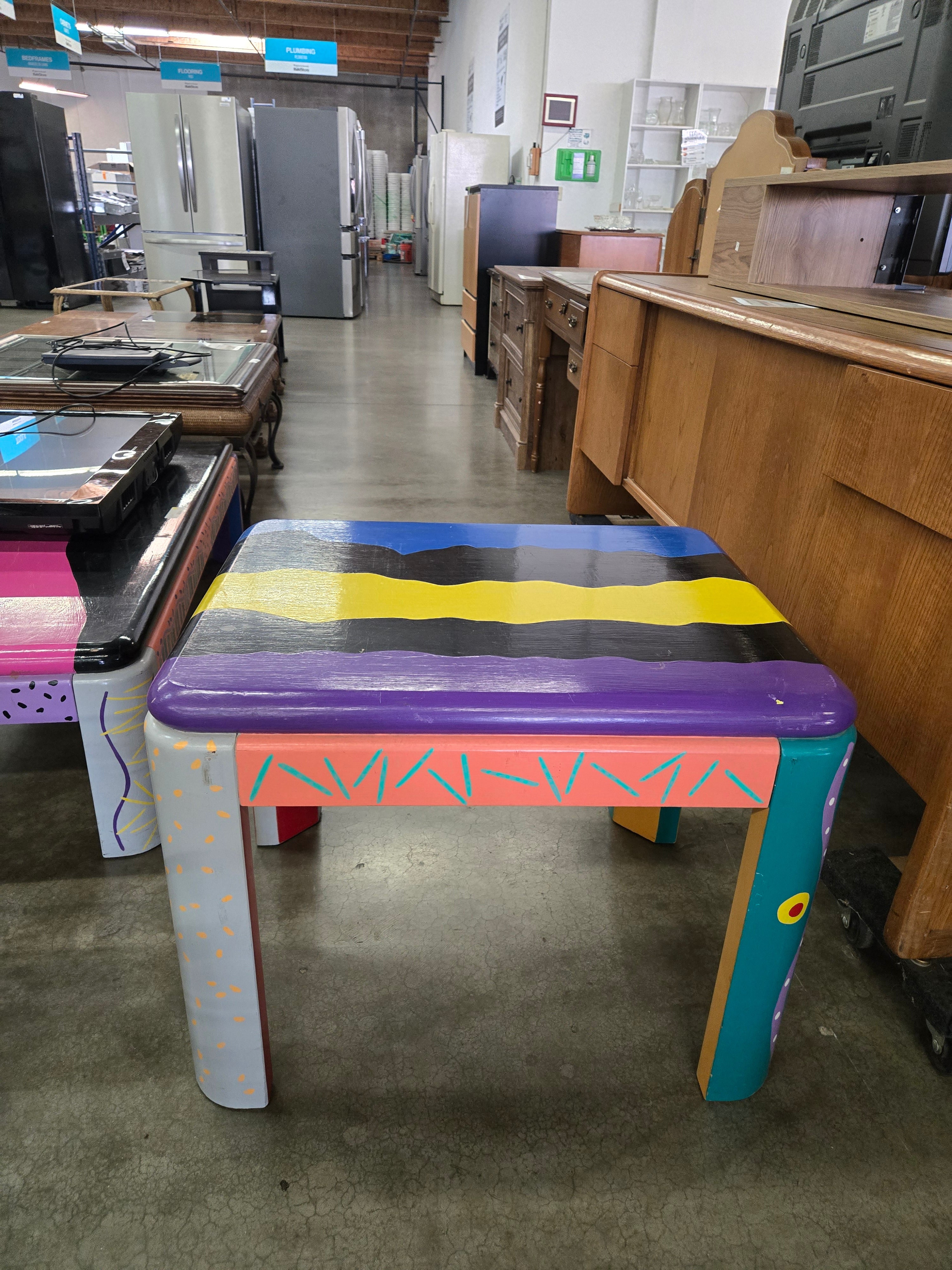 A vibrant side table featuring a playful hand-painted design in shades of purple, blue, yellow, and pink, with a glossy finish. Approximate Size: 1.5 x 2 x 2
