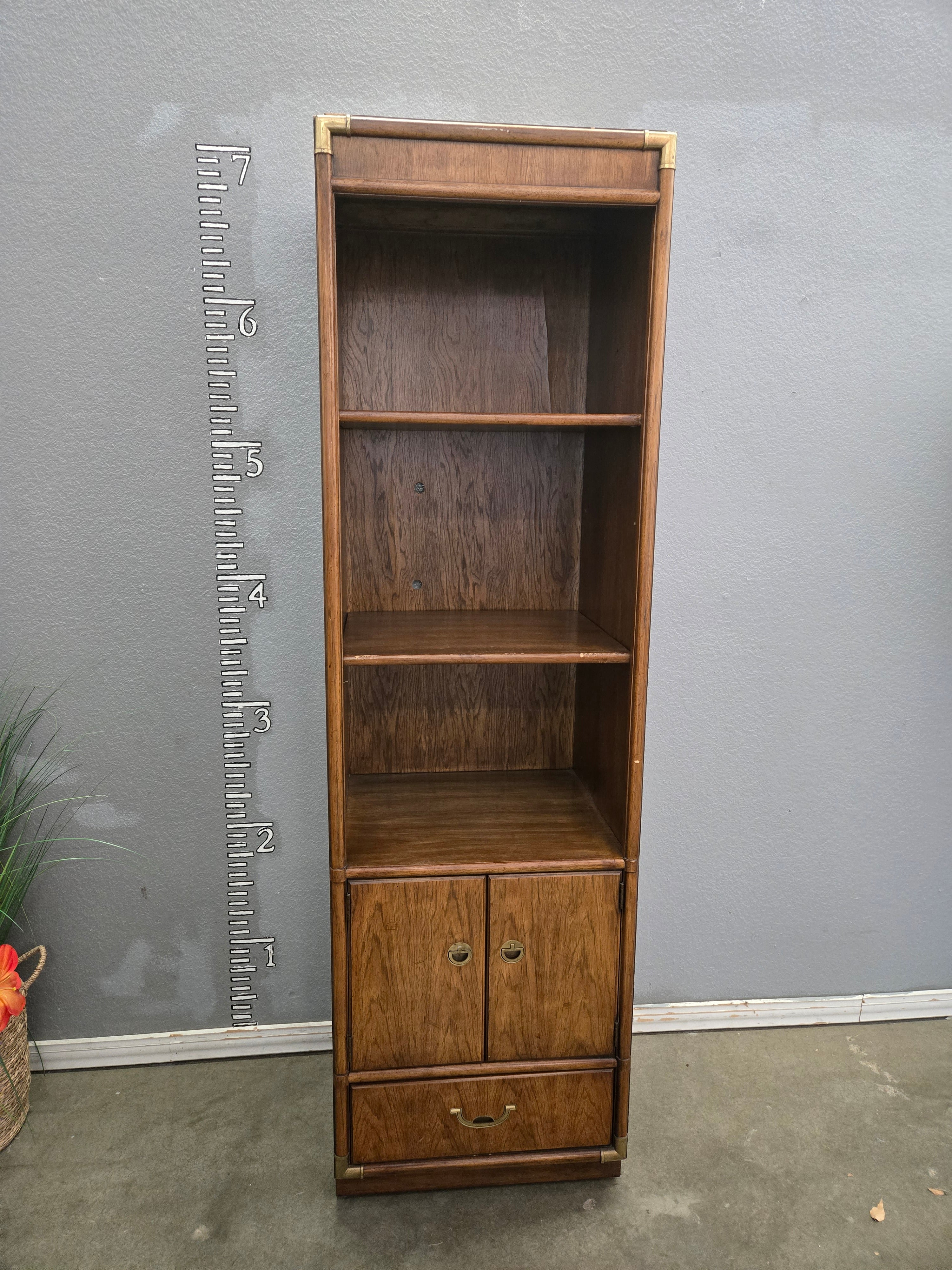 This elegant vintage bookshelf features a rich brown wood finish with brass accents, providing ample storage with three open shelves, a cabinet, and a drawer. The wood has a smooth, polished finish that showcases the natural grain beautifully. Approximate Size: 6.8 x 1.8 x 1.5