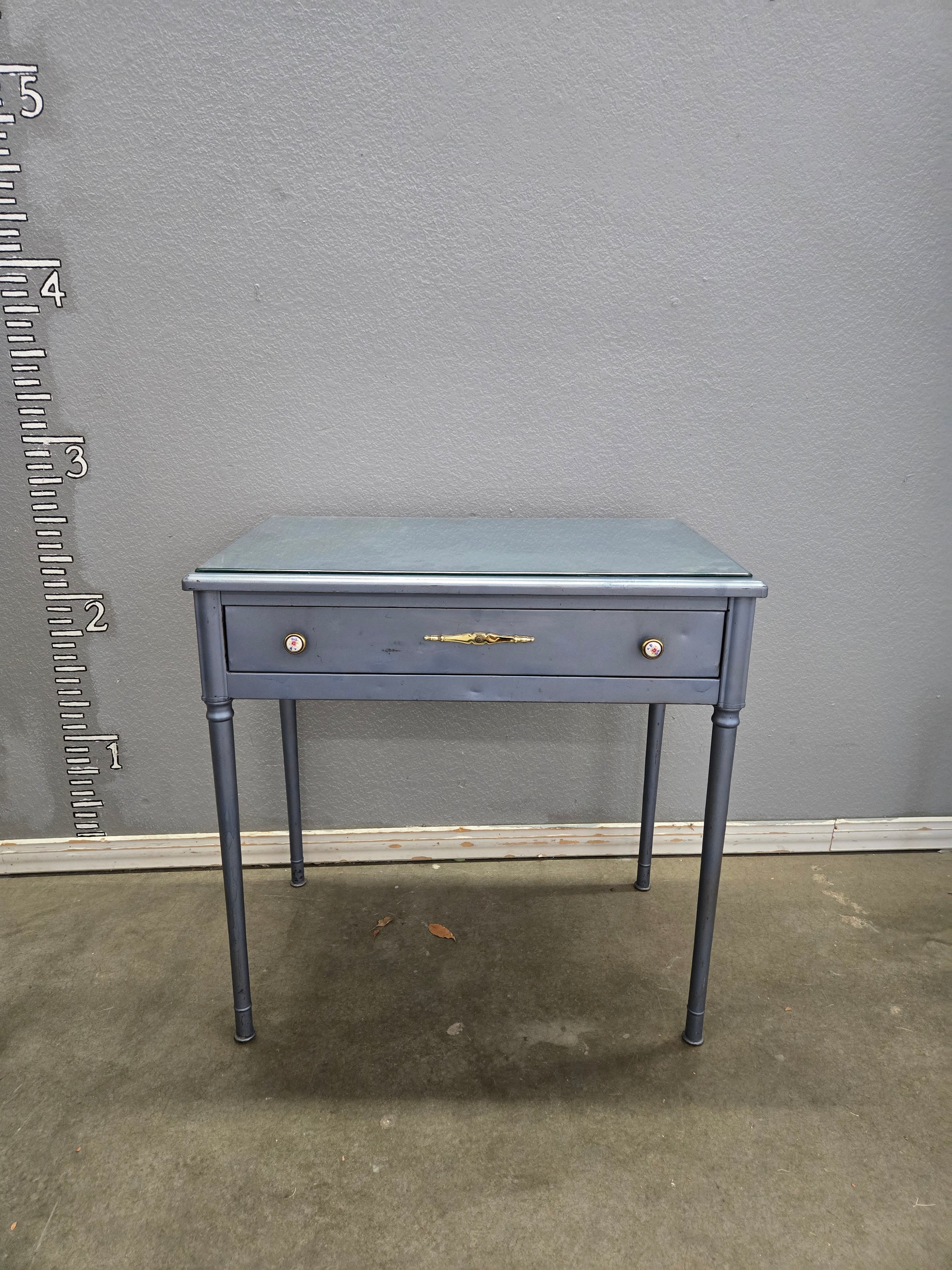 A charming vintage side table in a matte blue finish. Features a single drawer with classic hardware. Approximate Size: 3 x 2 x 1.5