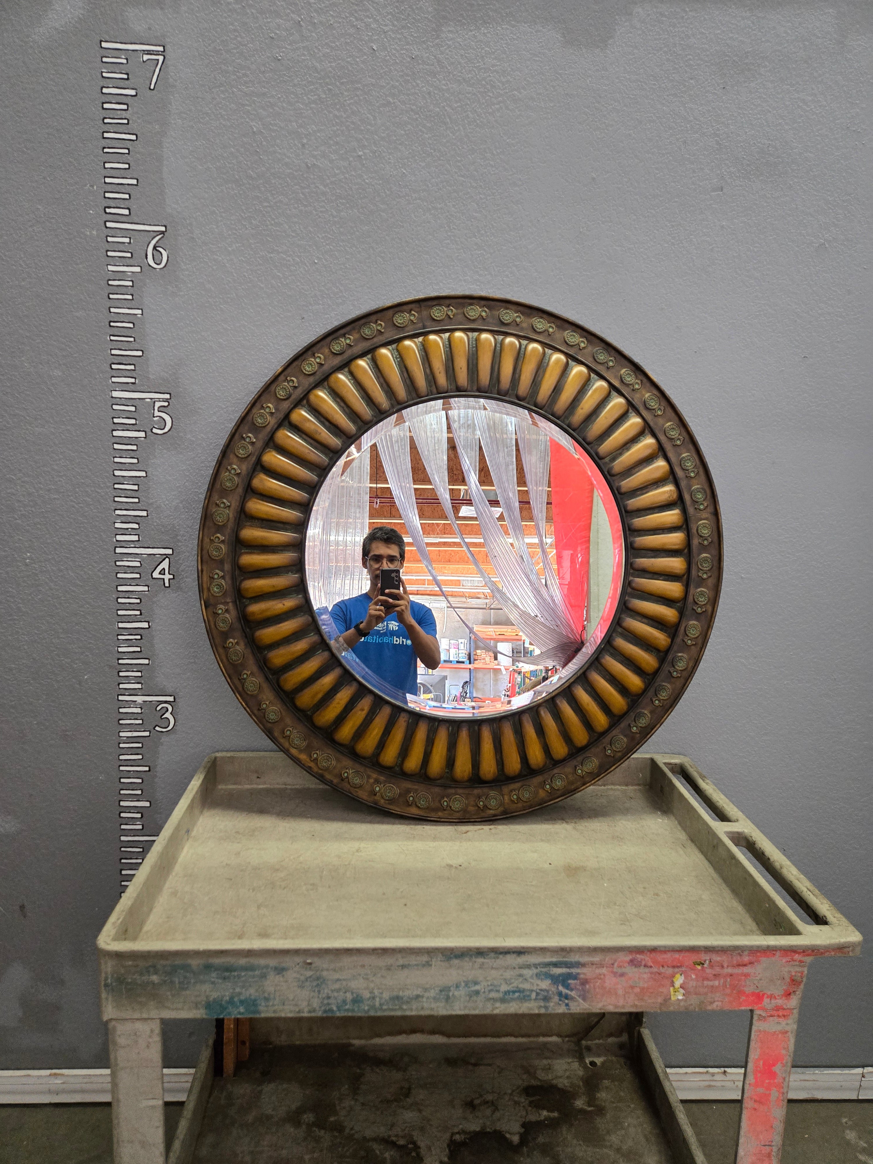 This stunning round mirror features a classic brown and gold finish, embellished with intricate detailing around the frame. The mirror's traditional design and vintage appeal make it an excellent addition to any room, adding depth and elegance to the space. Approximate Size: 3 x 3 x 0.5