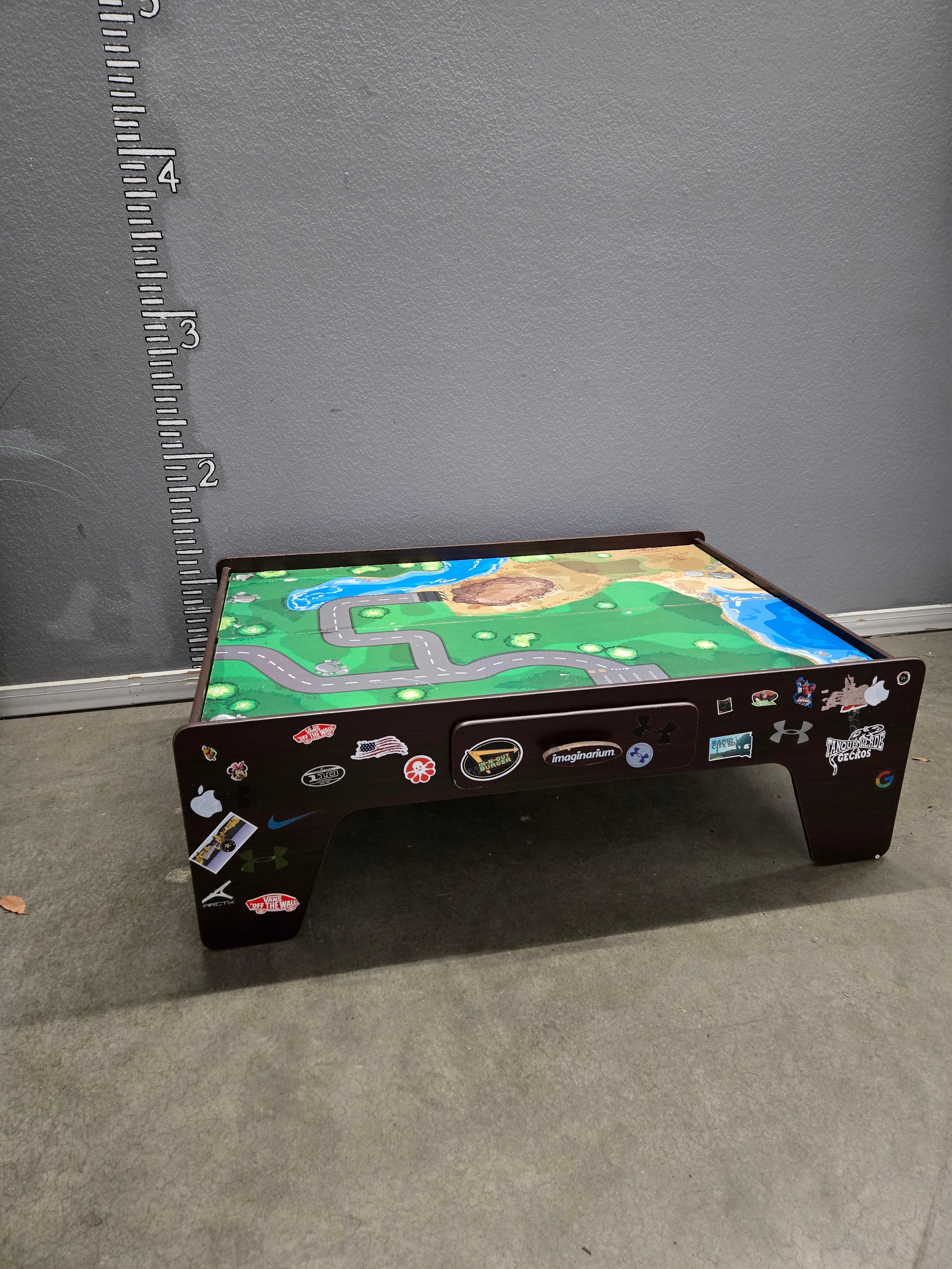 This children's play table features a vibrant multi-color road map design on a durable, brown wood finish. Adorned with various stickers for added fun, it's perfect for playtime activities. Approximate Size: 1.5 x 2.5 x 2