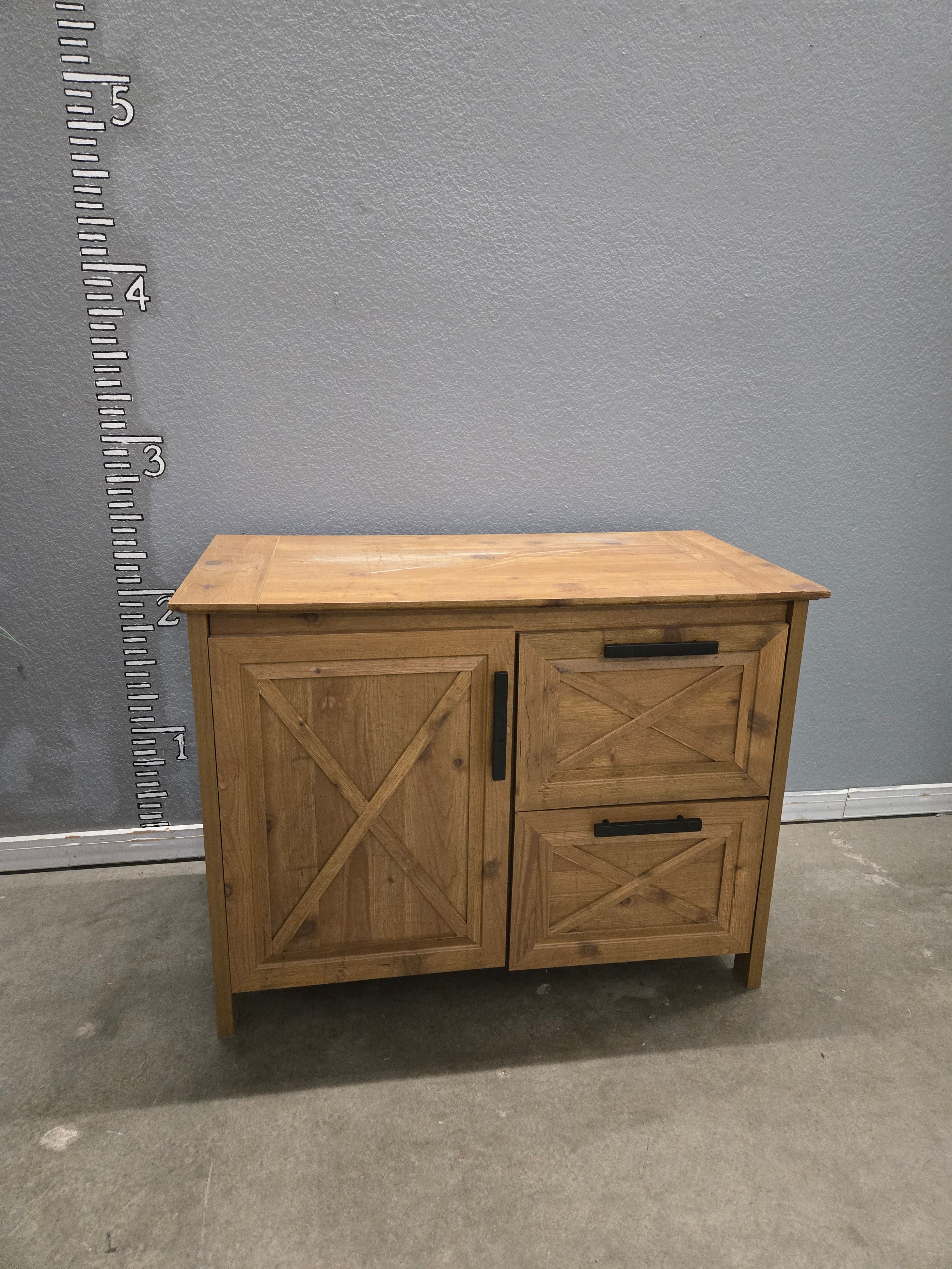 This charming cabinet features a warm light-brown wood color with a smooth, rustic finish. It includes a single-door compartment and two spacious drawers, offering ample storage space. Approximate Size: 2.5 x 3 x 1.5