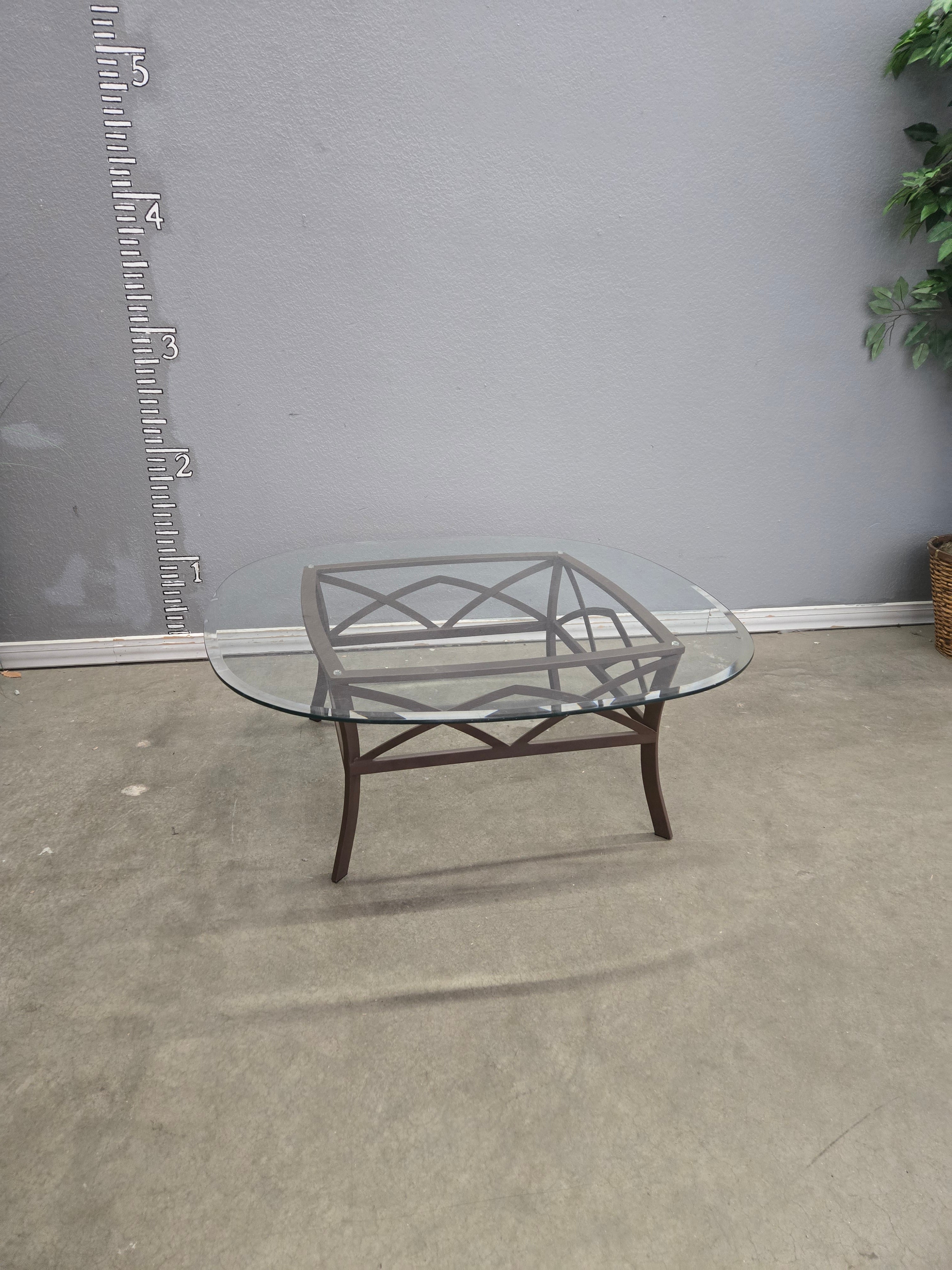 This elegant coffee table features a clear glass top with a brown metal frame, offering a sleek and contemporary look. The metal legs have a matte finish, providing durability and a stylish touch to any living area. Approximate Size: 2 x 4 x 2