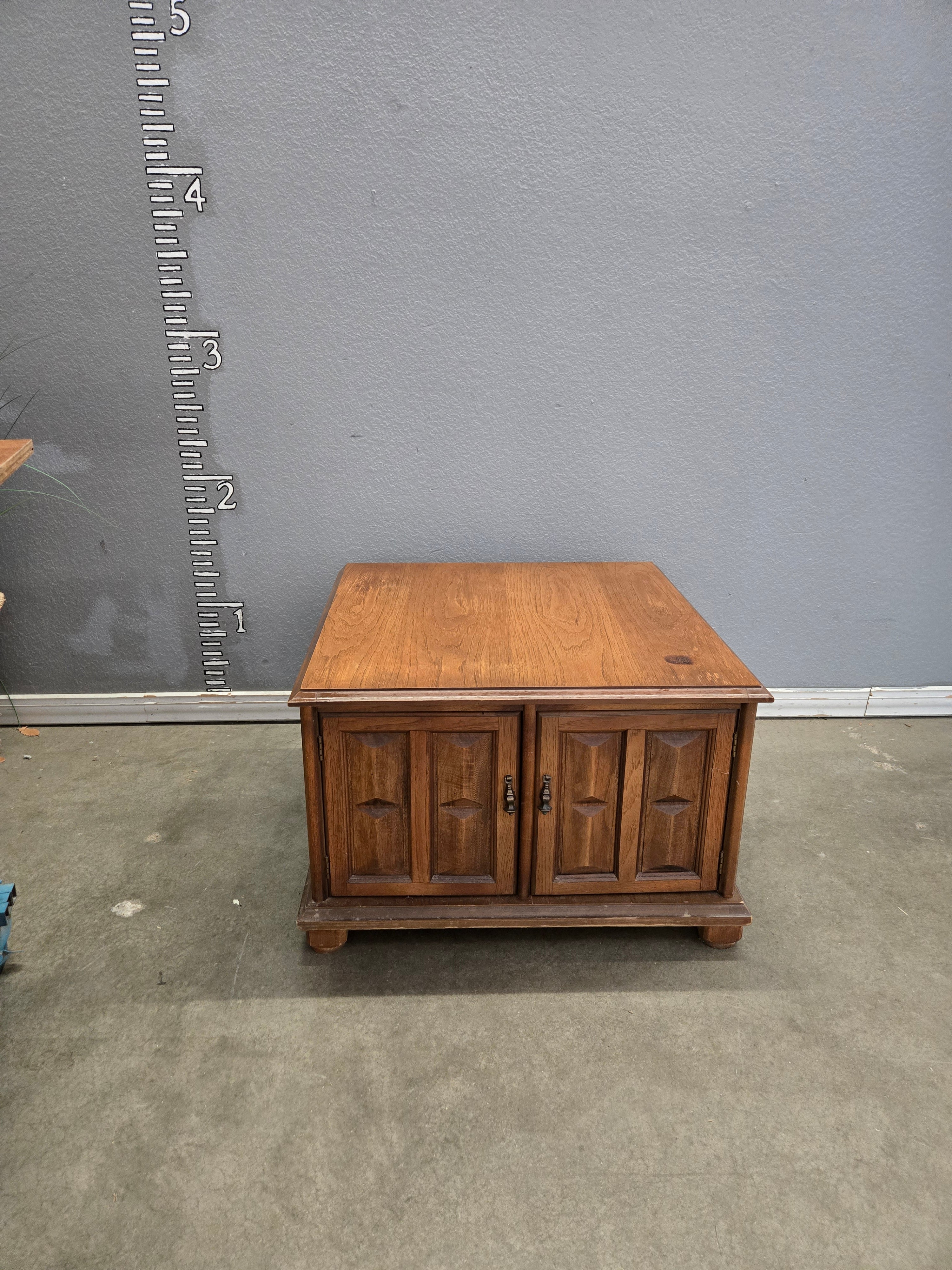 This charming vintage side table cabinet features a rich brown finish with a natural wood grain texture. Perfect for adding a rustic touch to any room, it includes two panelled doors with classic hardware. Approximate Size: 2 x 2 x 2