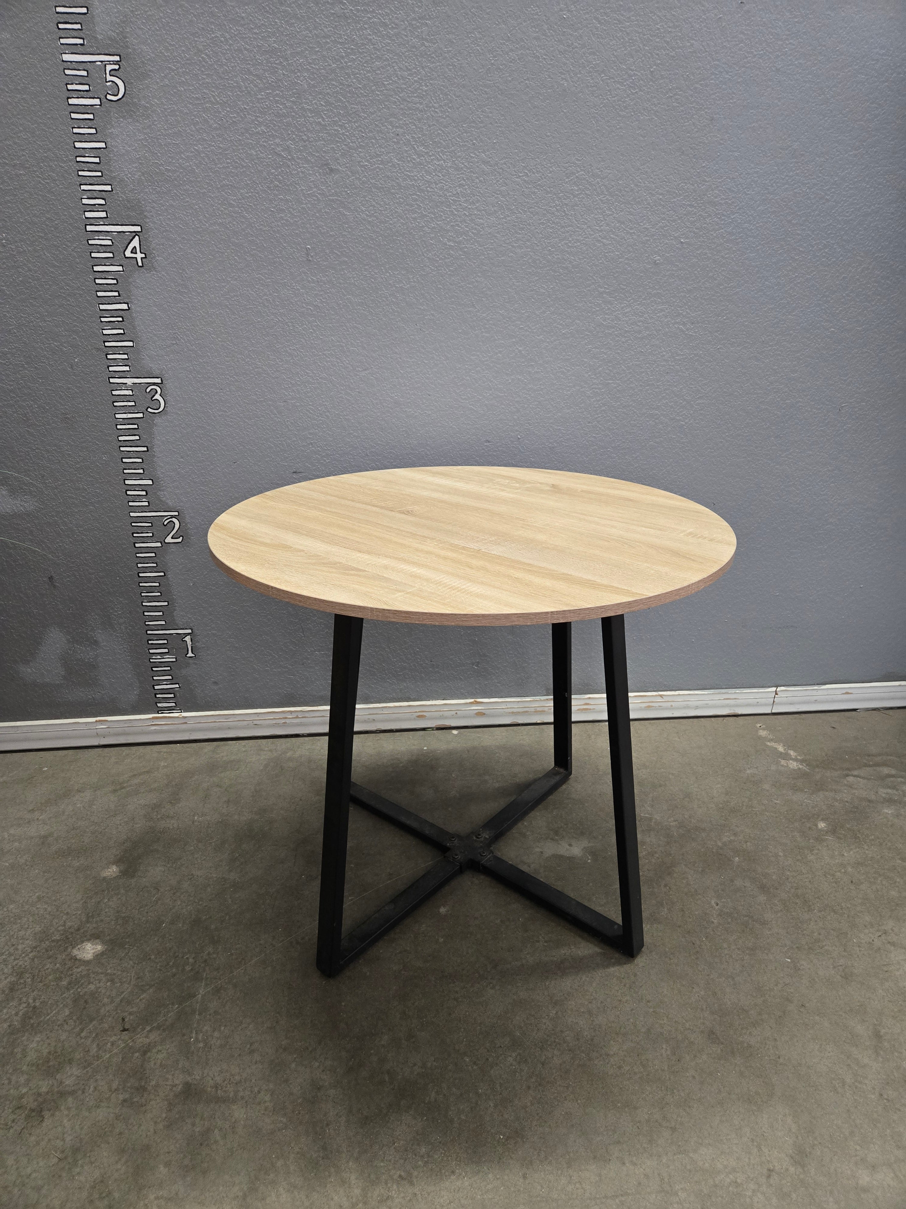 A modern side table featuring a light wood finish top with a sleek black metal base. Perfect for adding style and functionality to any living space. Approximate Size: 2.5 x 1.5 x 1.5