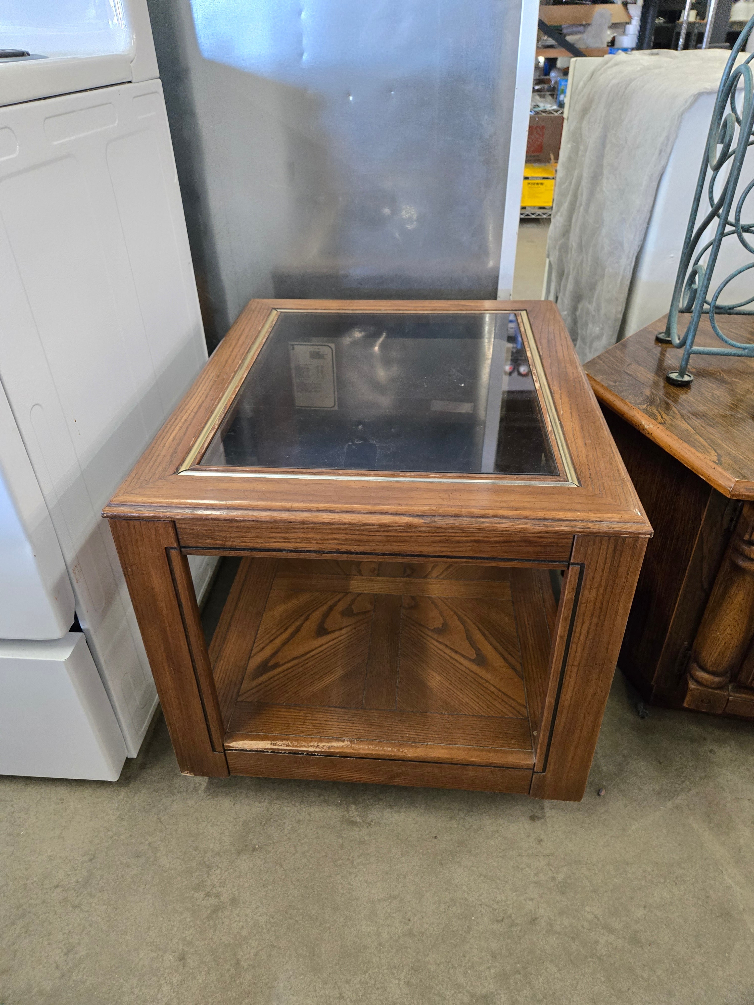 This vintage end table features a rich brown wooden finish with a clear glass top. The wood displays a natural grain pattern, providing a rustic yet elegant look. The table is sturdy and perfect for living room use. Approximate Size: 2 x 2 x 2