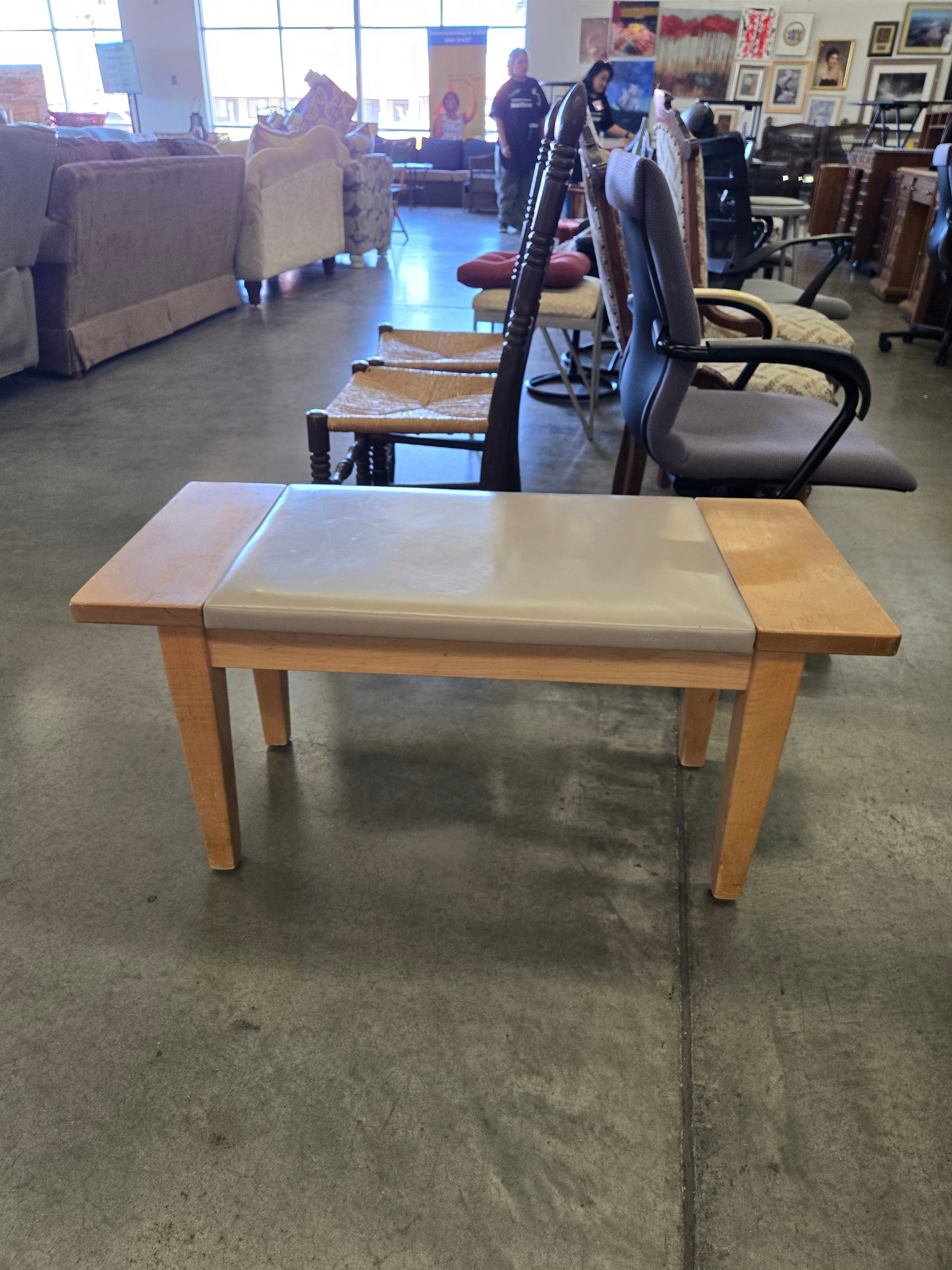 A stylish bench featuring a natural wood frame with a sleek gray faux leather seat. Perfect for any modern setting with its minimalist design. Approximate Size: 1.5 x 4 x 1.5