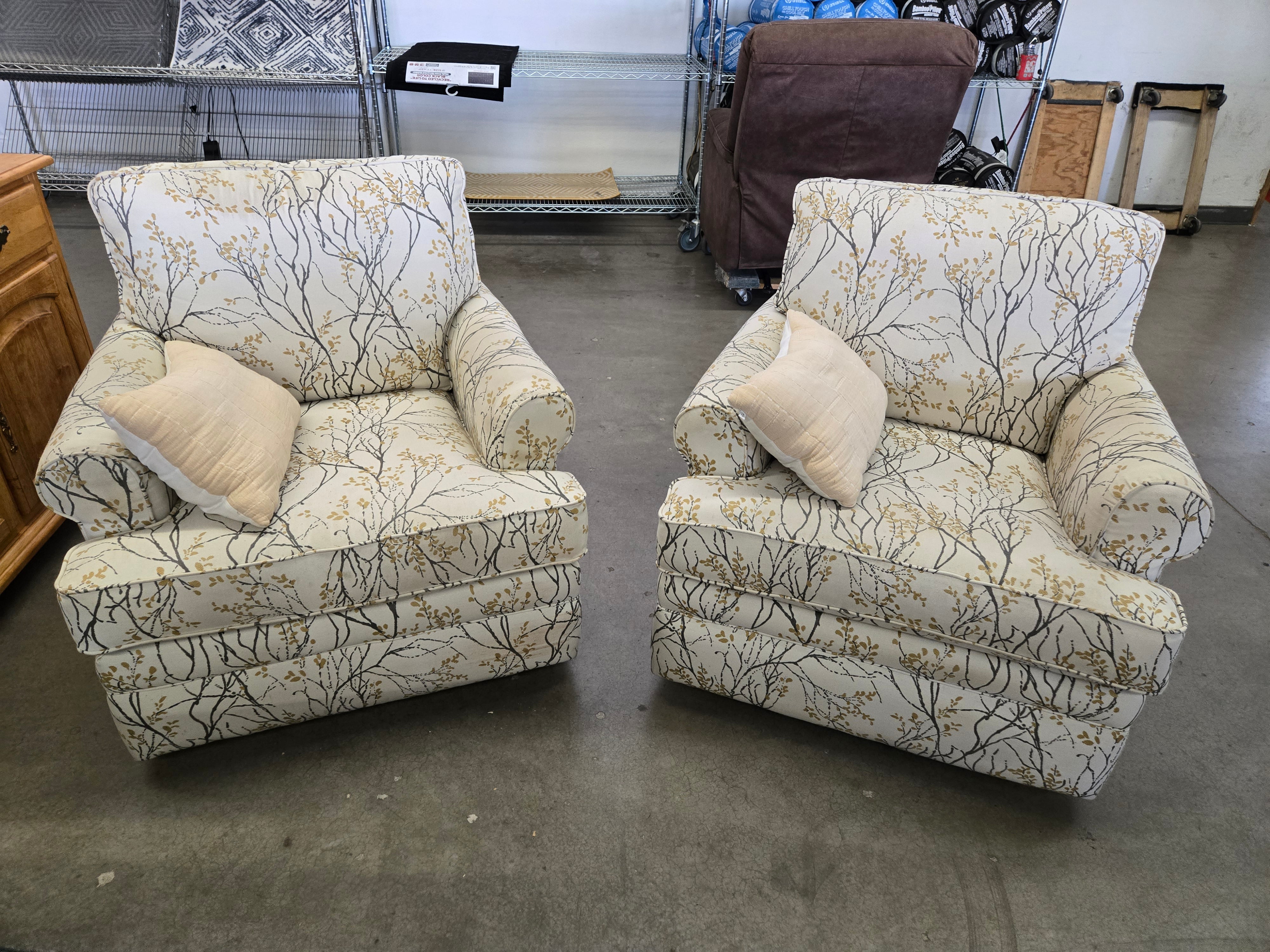 A charming set of armchairs with a cream and gold floral pattern fabric. These chairs feature a plush, comfortable design perfect for lounging. Approximate Size: 3 x 3 x 3