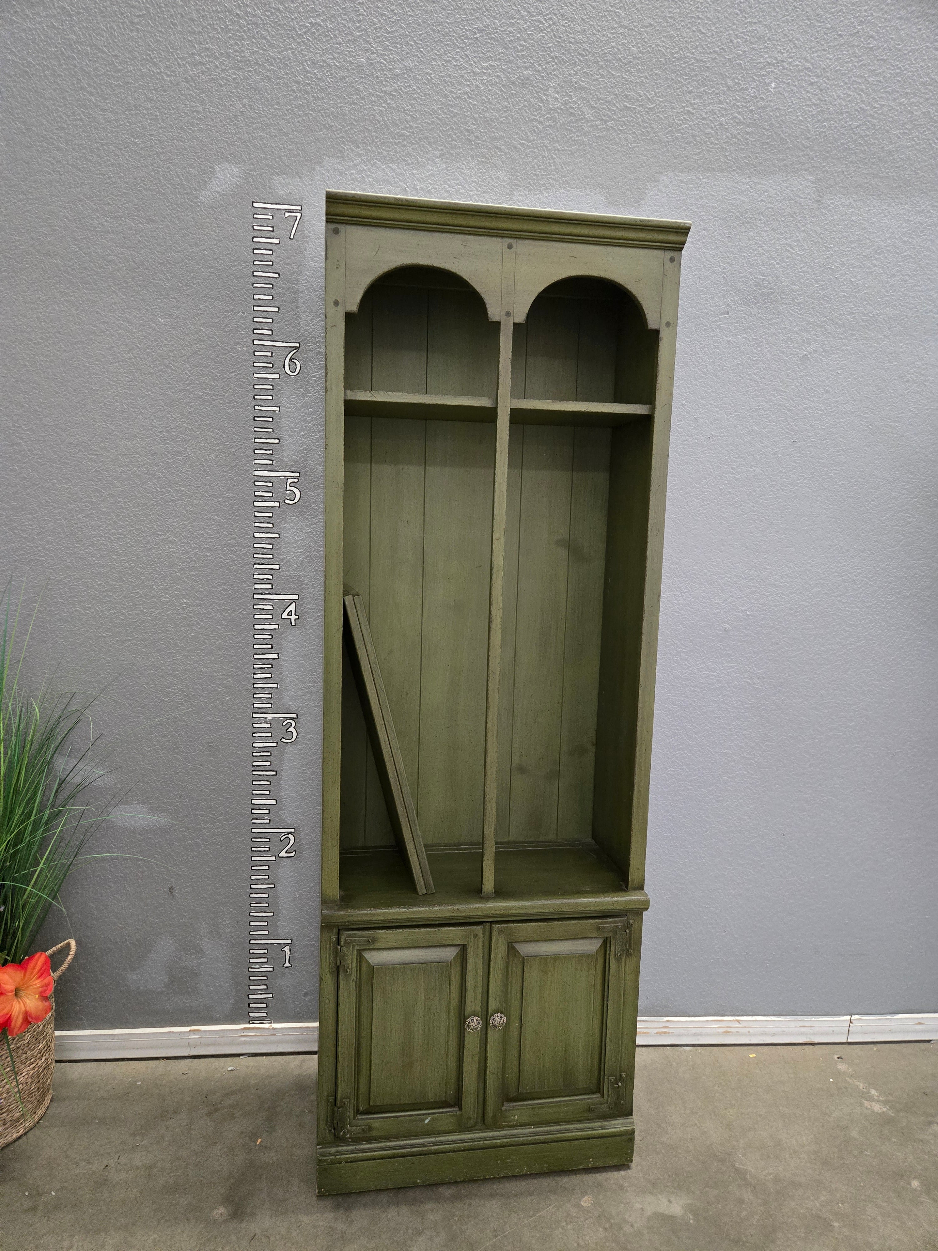 Olive green wooden cabinet with a distressed finish featuring upper shelves and lower doors. Perfect for adding rustic charm to any room. Approximate Size: 7 x 2.5 x 1