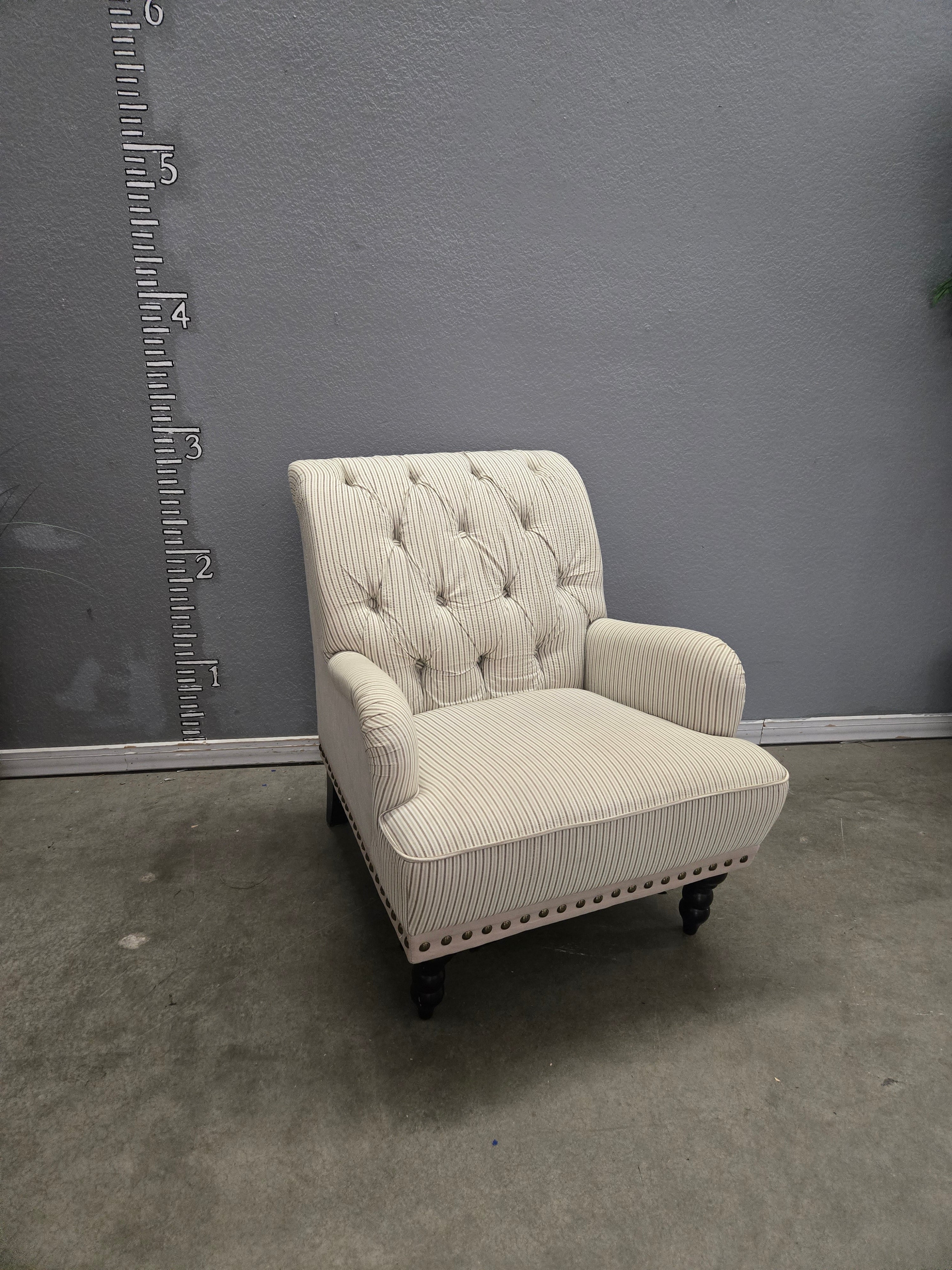Elegant armchair featuring a cream and black striped fabric with a button-tufted back and nailhead trim. Ideal for a classic touch in your living space. Approximate Size: 3 x 2.5 x 2.5