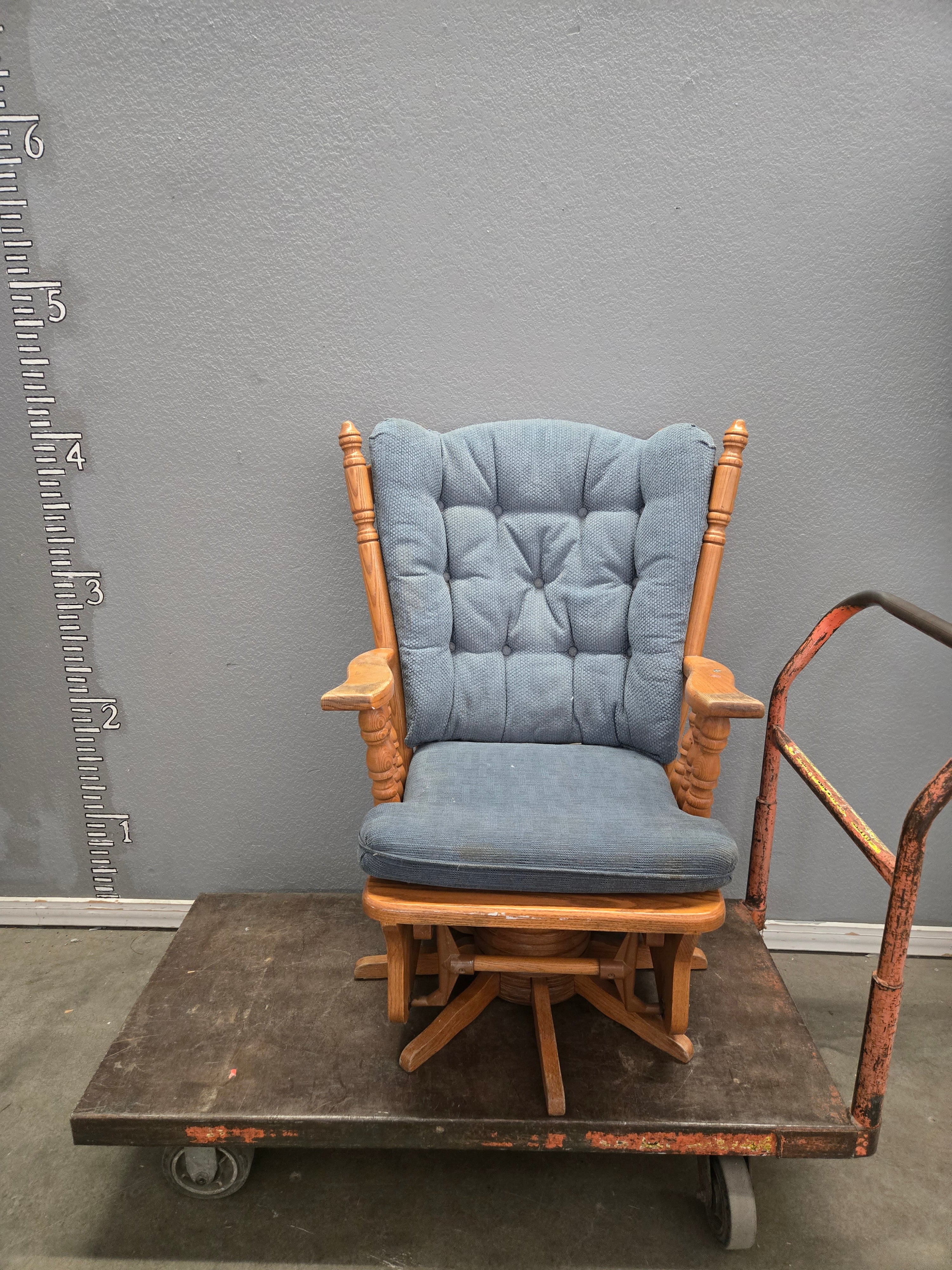 This vintage rocking chair features a sturdy wooden frame with a light oak finish. It includes plush blue cushioned upholstery, perfect for comfort and style in your living room. Approximate Size: 4 x 2.5 x 2.5