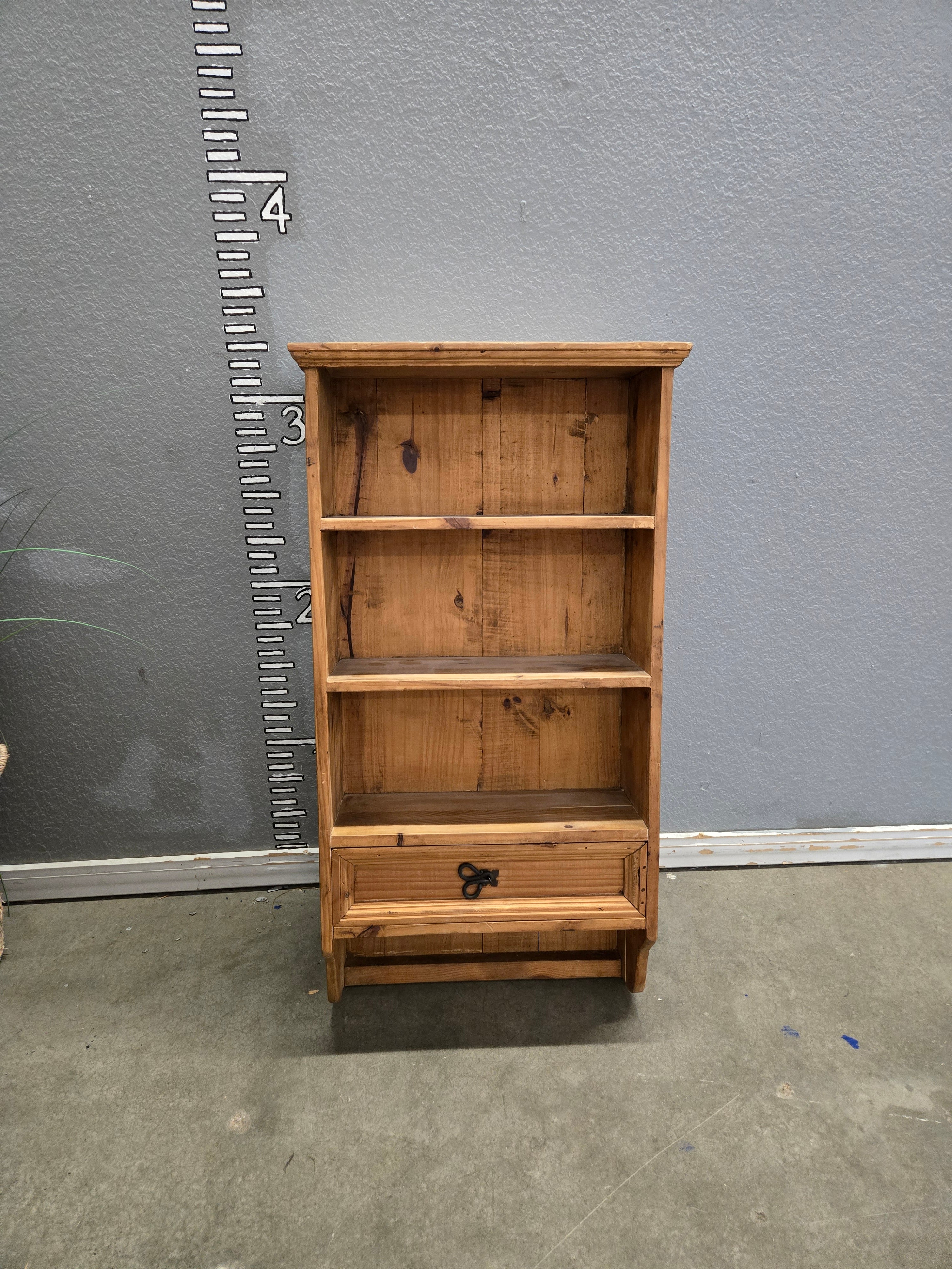 This charming rustic bookshelf is crafted from natural wood, offering a warm and inviting appearance. The wood has a natural finish, highlighting its unique grain patterns. Featuring two spacious shelves and a handy drawer with a black metal handle for extra storage, this piece is perfect for adding both style and functionality to any room. Approximate Size: 4 x 2 x 1