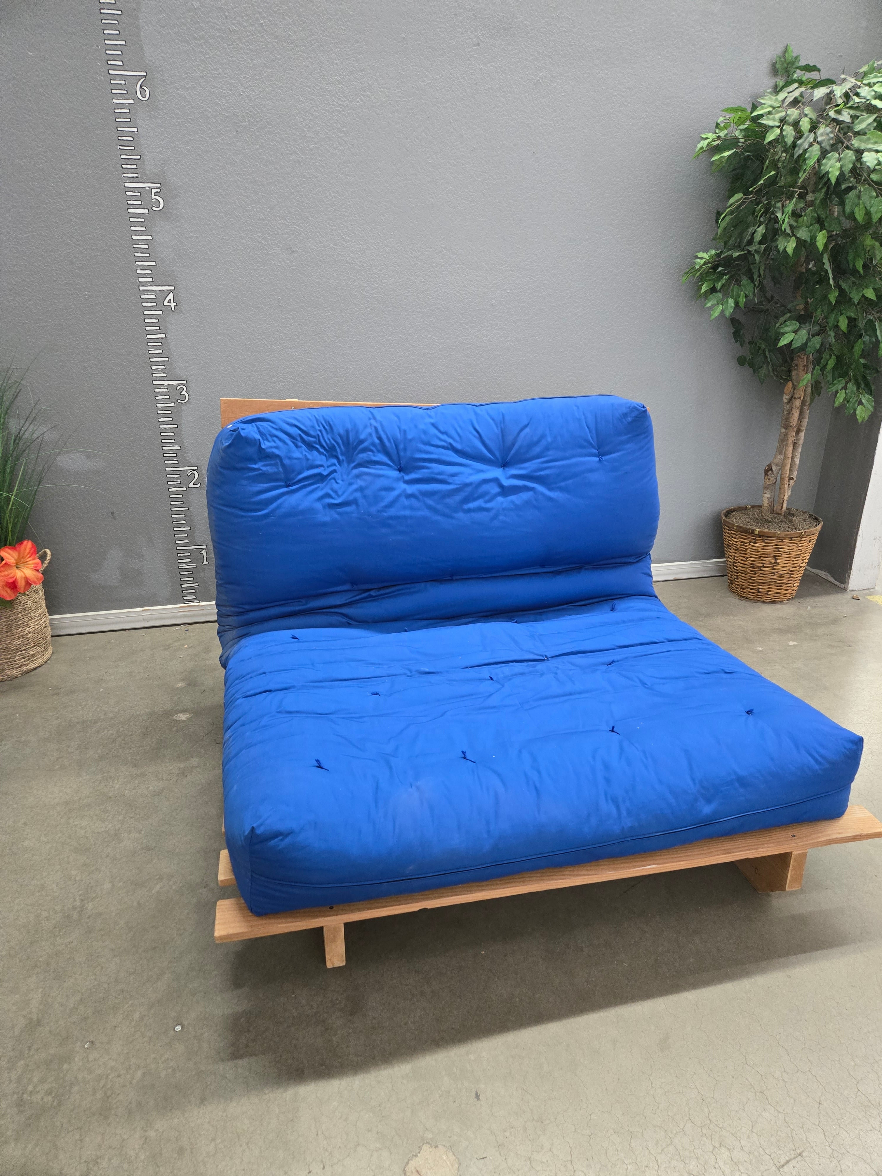 This versatile futon features a vibrant blue cushion with a sleek, tufted finish. The cushion rests on a sturdy wooden frame, offering a contemporary design that complements any living space. Perfect for accommodating guests or relaxing, this futon seamlessly transforms from sofa to bed. Approximate Size: 2 x 4.5 x 3