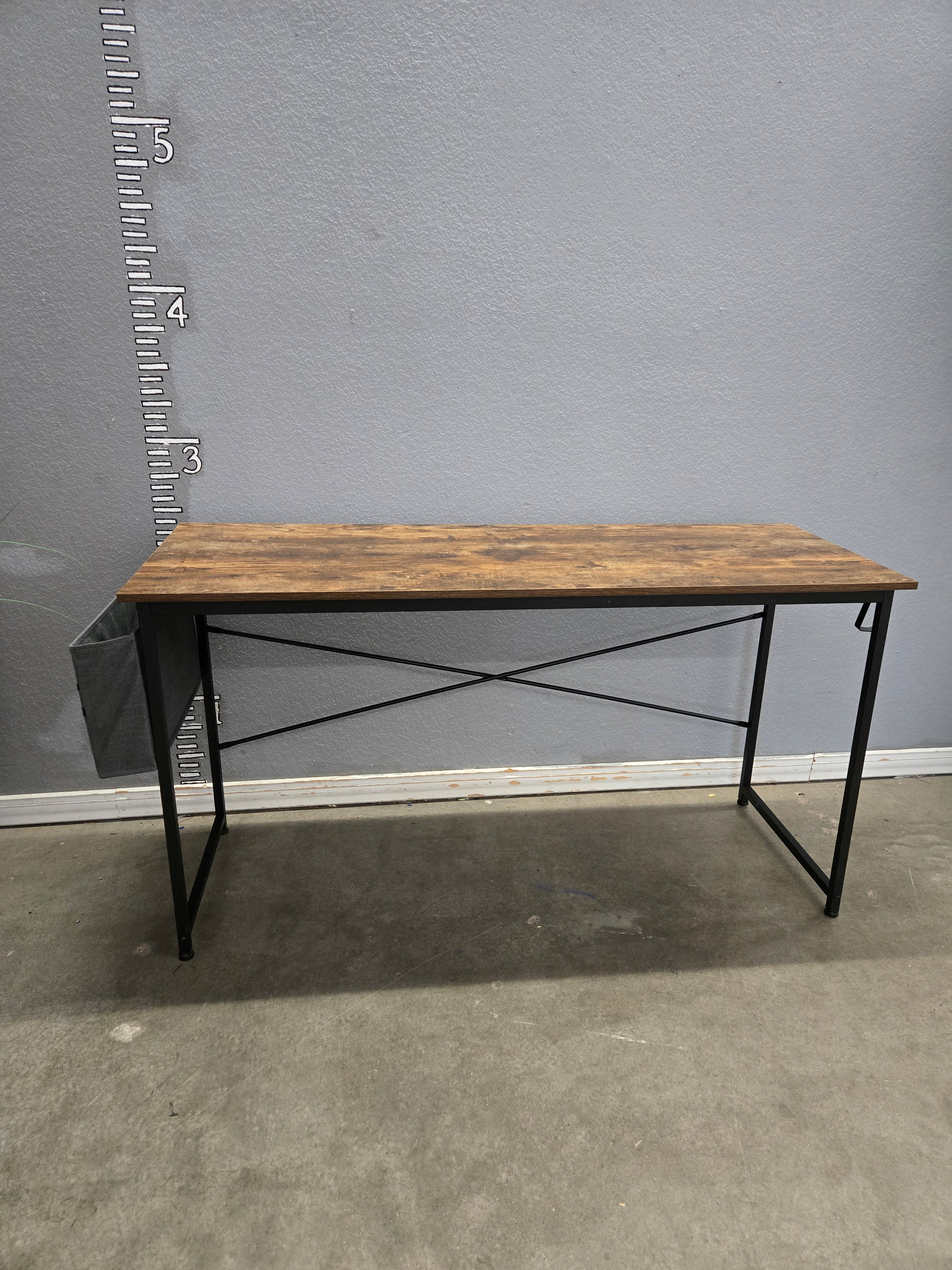 This console table features a rustic industrial design, combining a natural wood top with a black metal frame. The wood has a warm, brown finish, providing a vintage aesthetic. The table includes a fabric side pocket for convenient storage. Approximate Size: 2.5 x 4 x 1.5