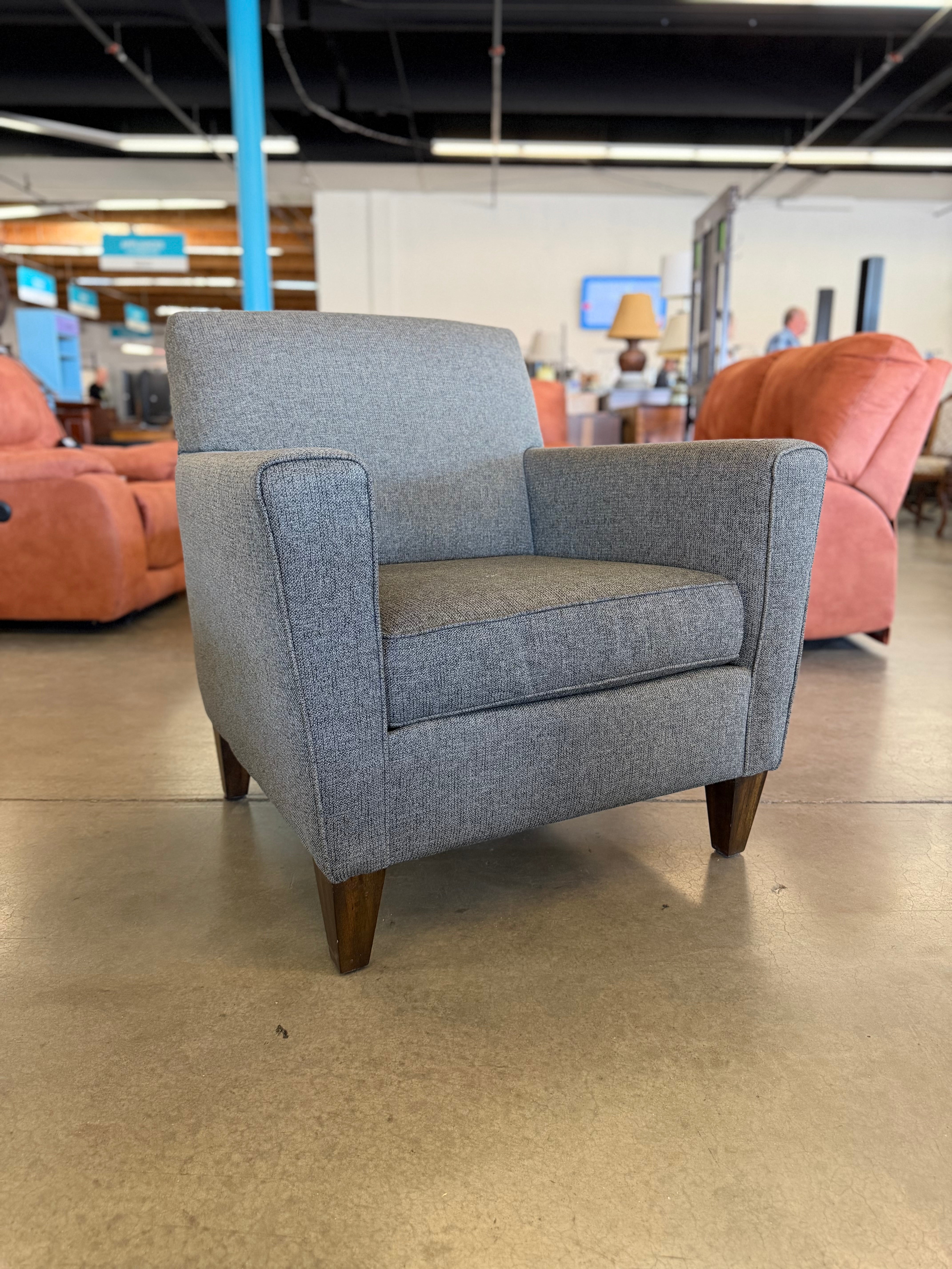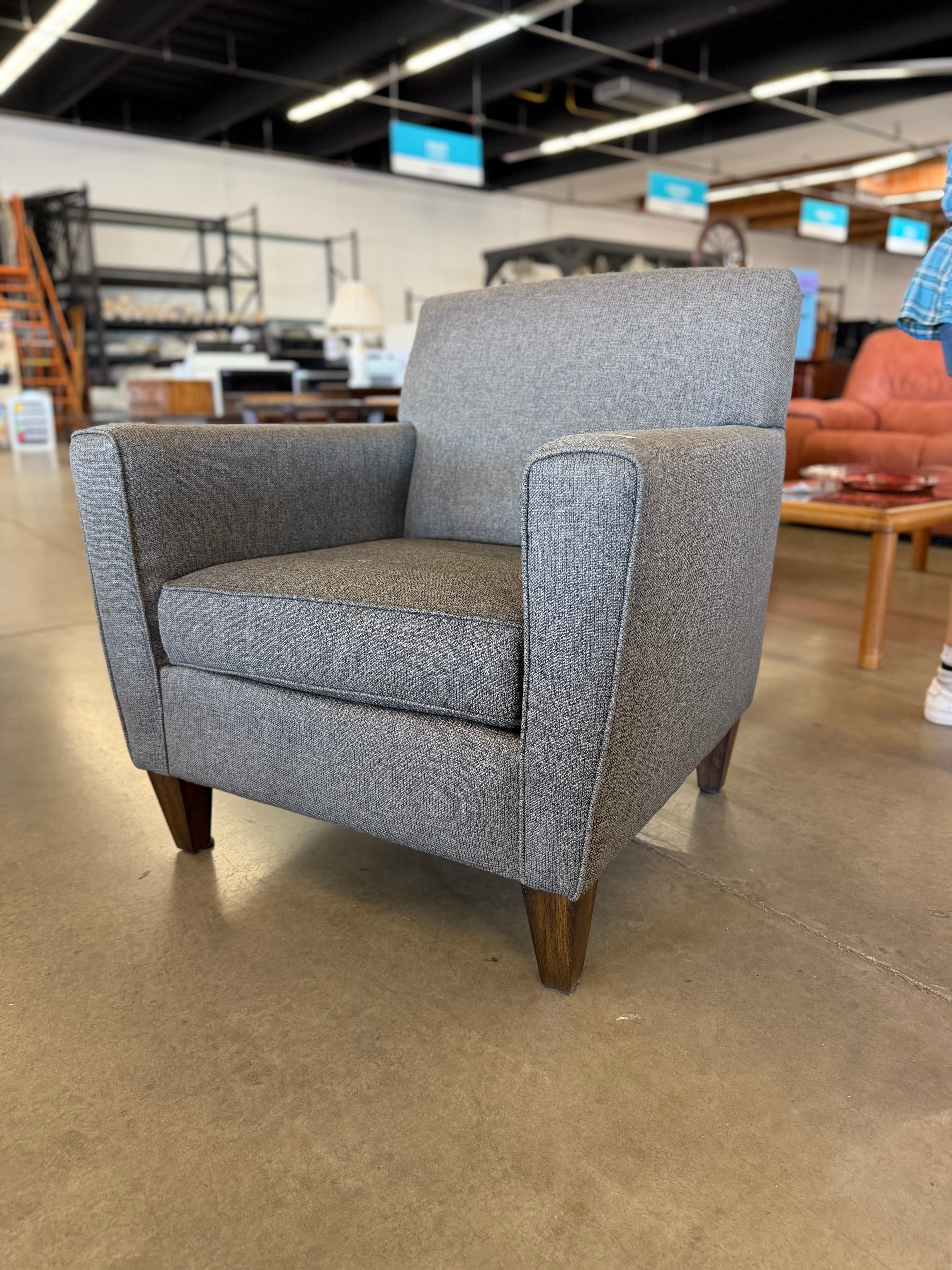 This elegant armchair features a soft gray fabric with a smooth finish, perfect for adding a touch of sophistication to your living space. The sturdy wooden legs complement its contemporary design. Approximate Size: 3 x 2.5 x 2.5