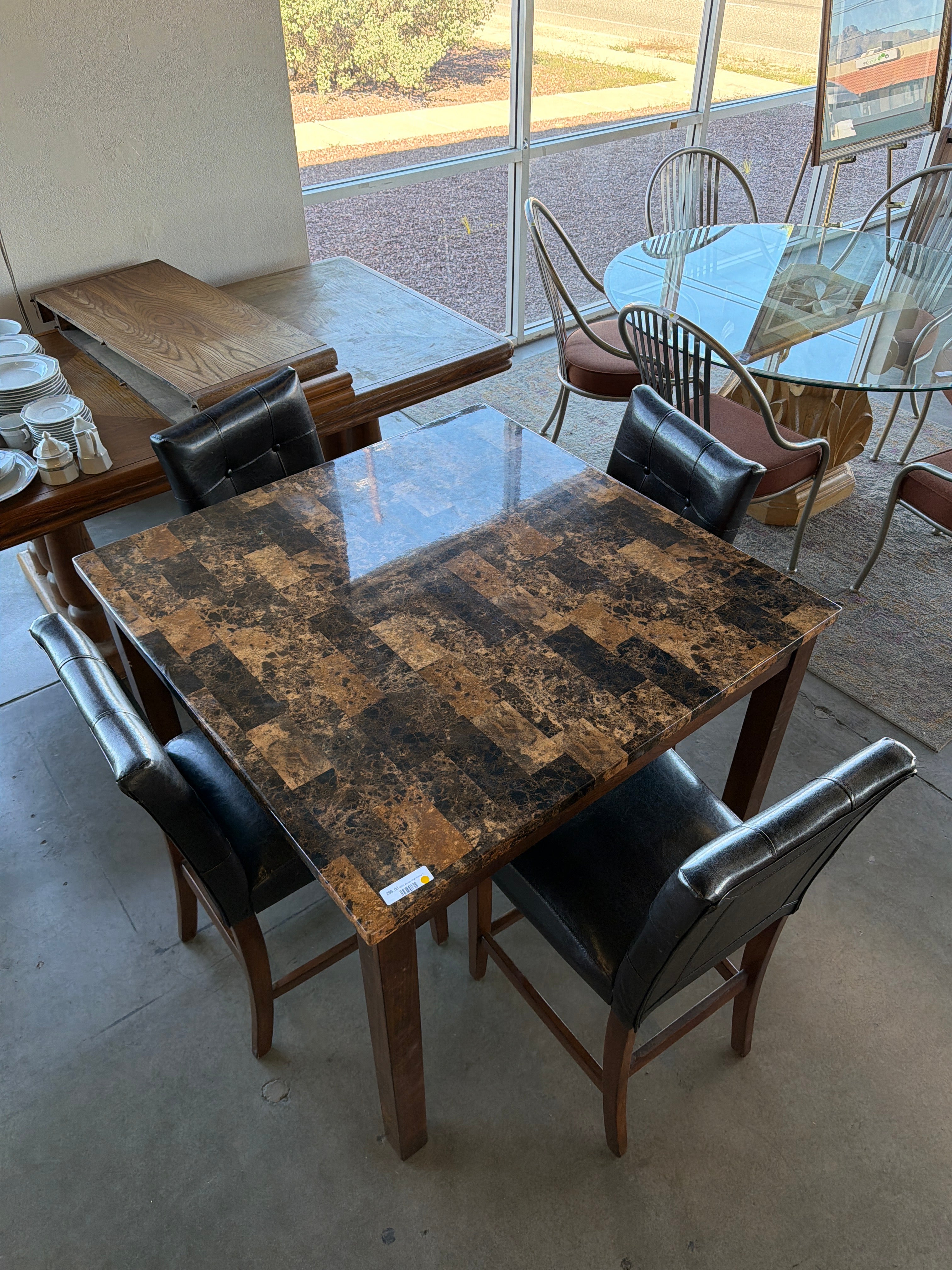 This elegant high dining table set features a sturdy wooden table with a polished finish and four stylish black leather chairs. The luxurious leather upholstery offers comfort, while the dark wood provides a timeless appeal. Approximate Size: 4 x 3 x 3