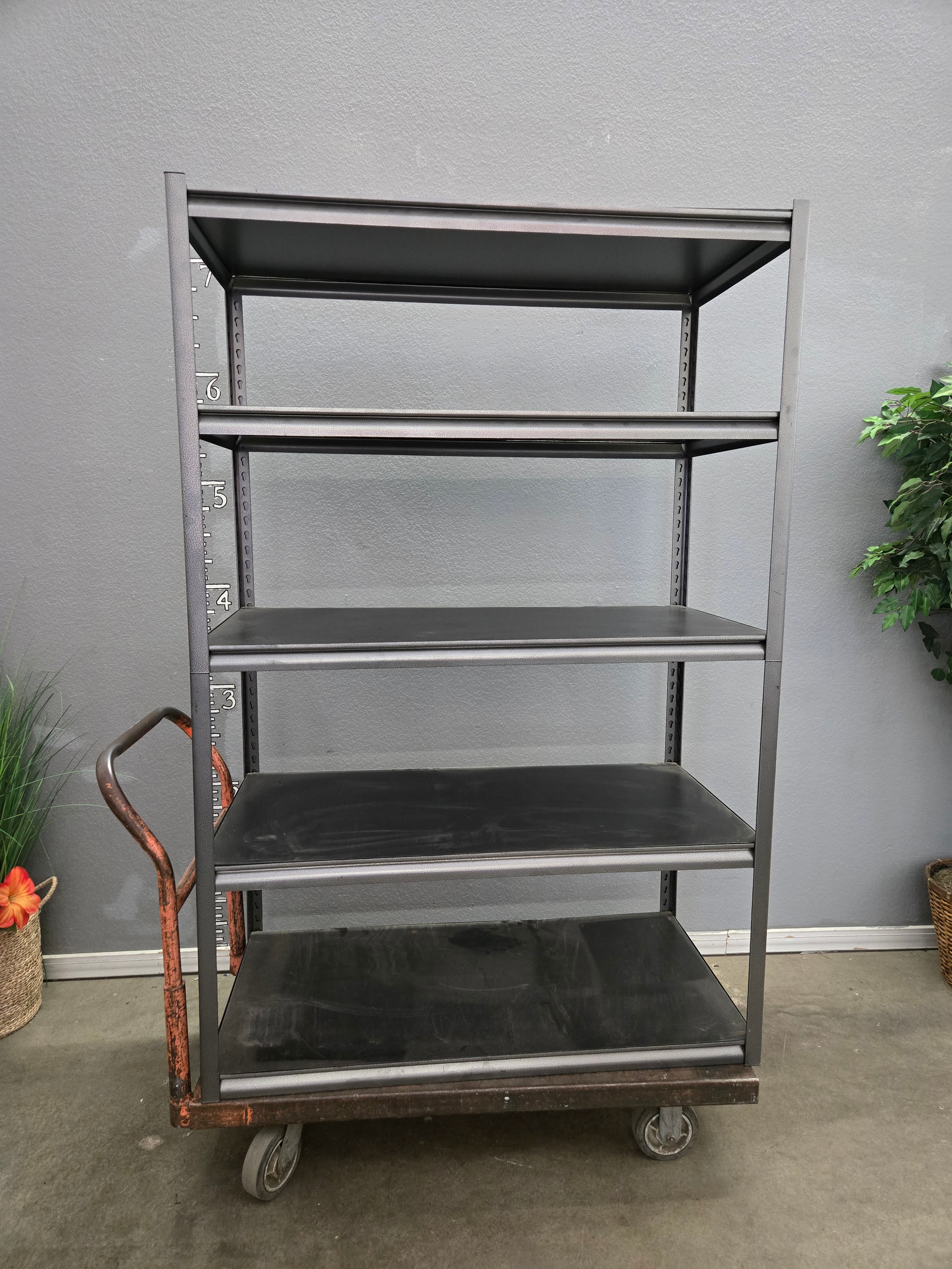 Robust industrial-style shelf unit in black with a solid metal finish. Features five spacious shelves for ample storage. Approximate Size: 6 x 4 x 2
