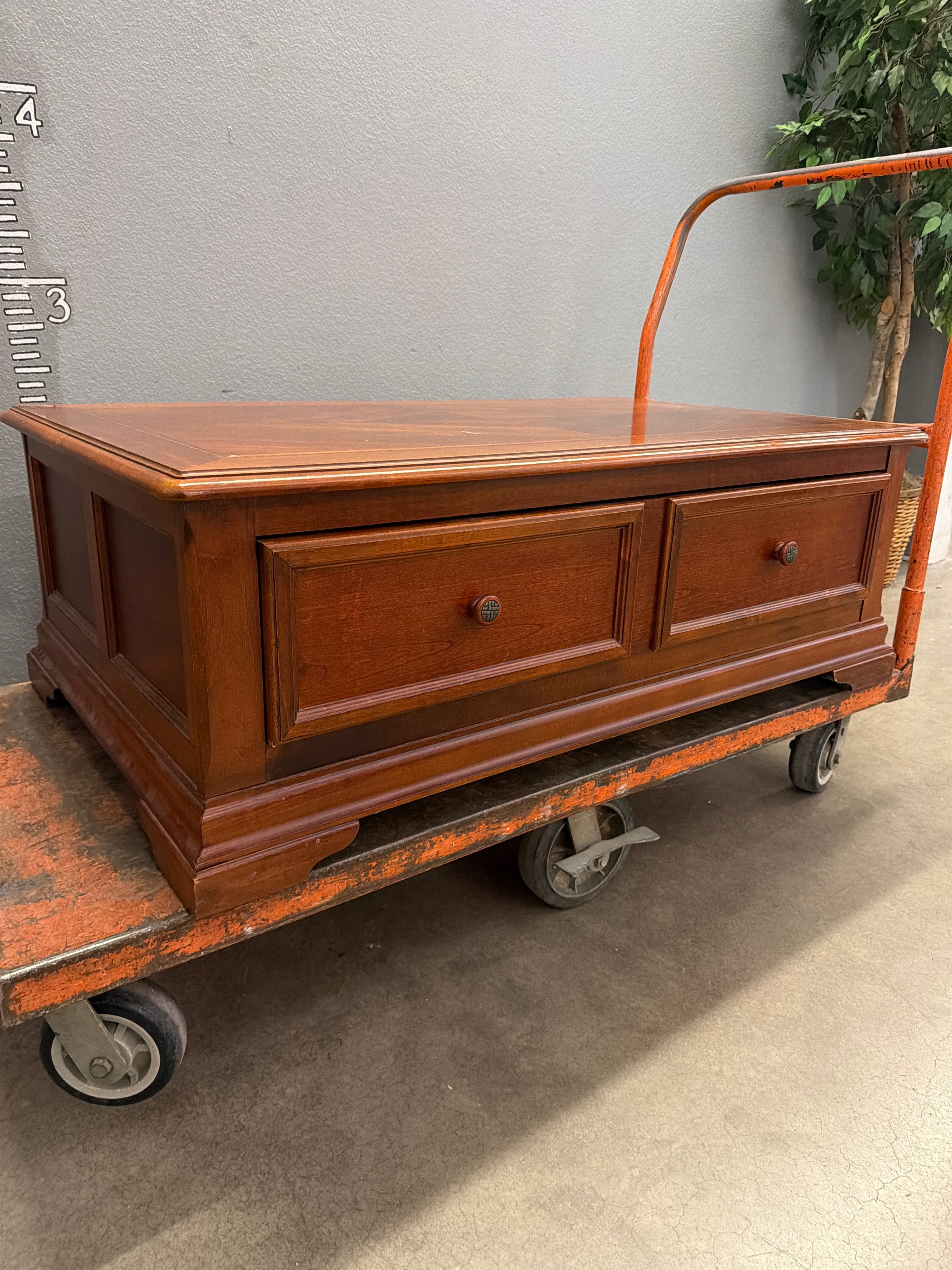 This classic wooden storage chest features a rich brown finish and sturdy construction. Ideal for a sophisticated living room setup, it offers ample storage with a charming, rustic appeal. Approximate Size: 2 x 3.5 x 2