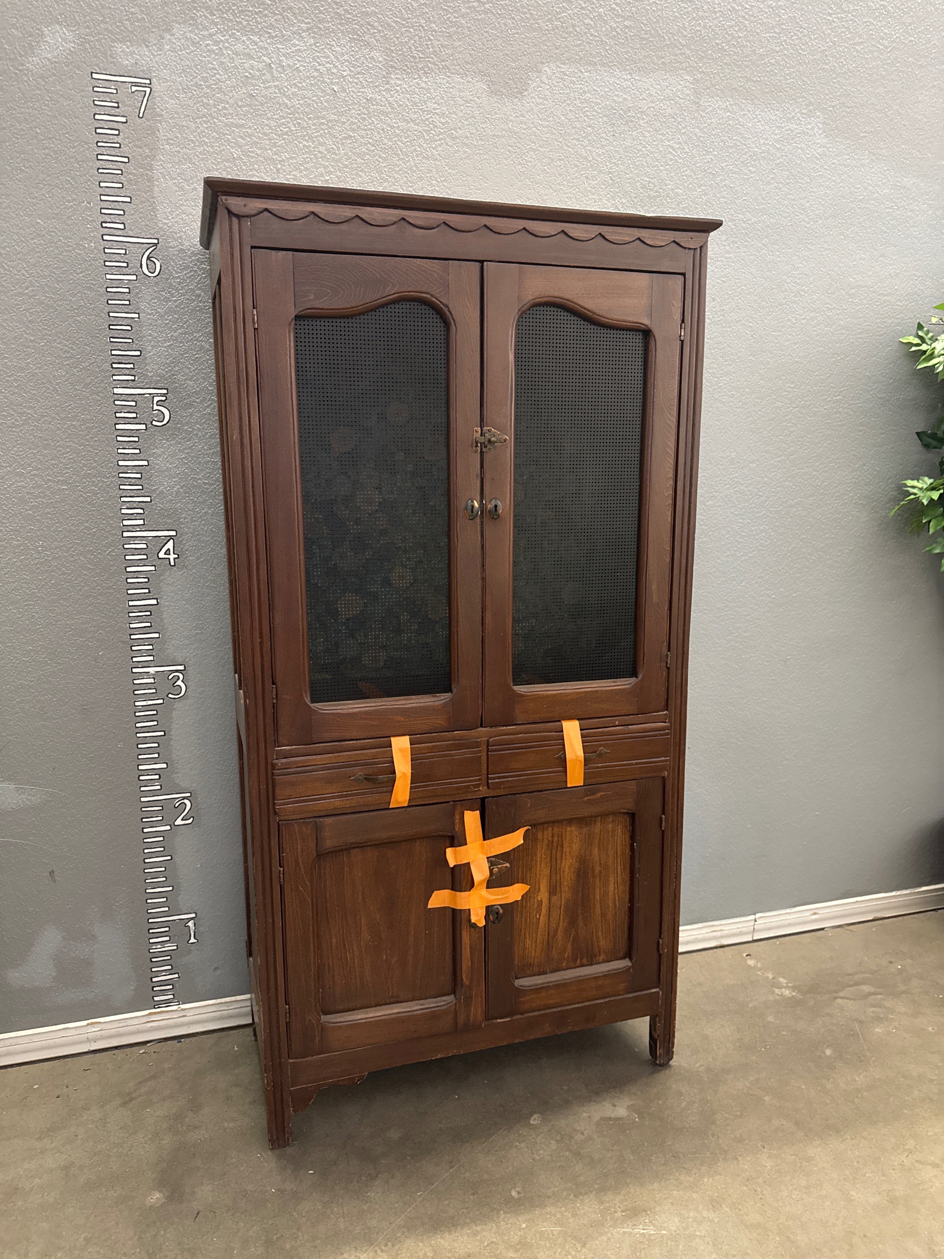 This vintage cabinet features a rich brown wooden finish with mesh panel doors, providing a rustic yet elegant appearance. It is perfect for storing your kitchenware or dining essentials. Approximate Size: 6 x 3 x 1.5