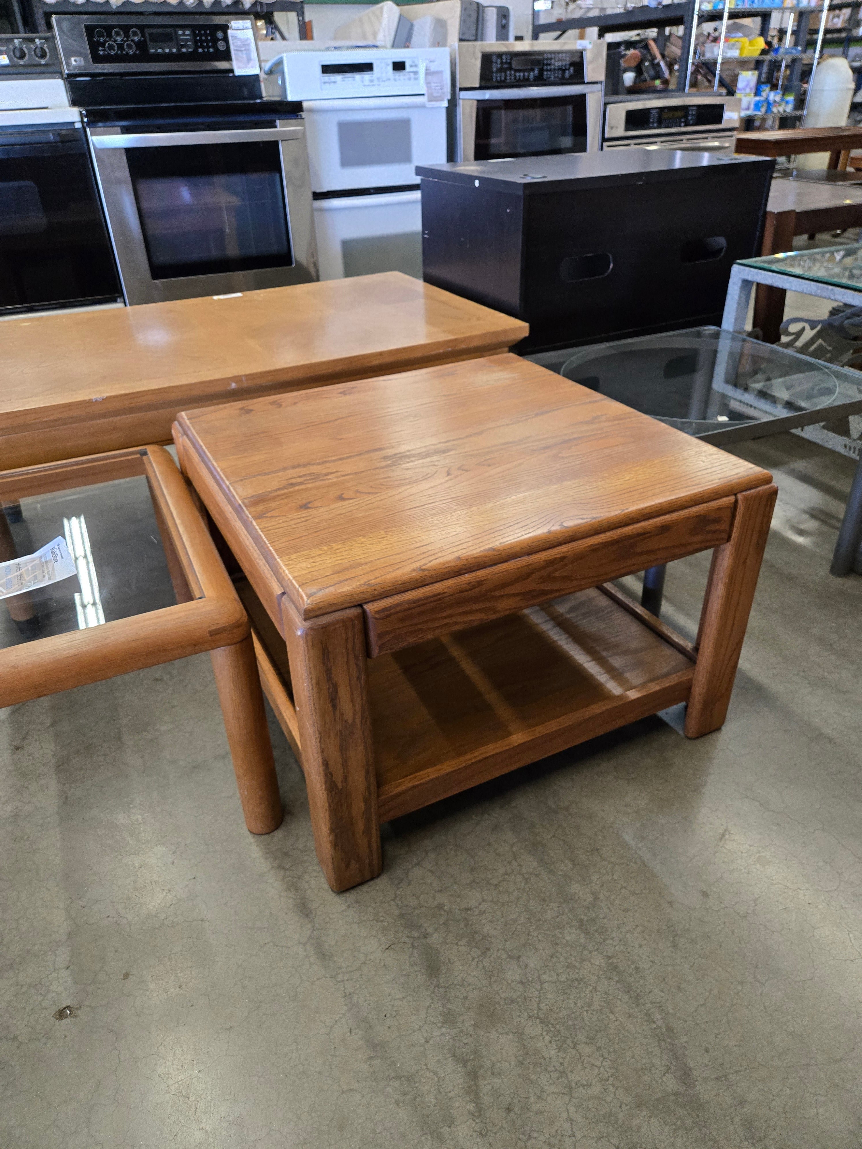 This elegant end table features a warm oak finish and a sturdy construction, perfect for adding a classic touch to your living space. The table includes a convenient lower shelf for additional storage or display. Approximate Size: 2 x 2 x 2