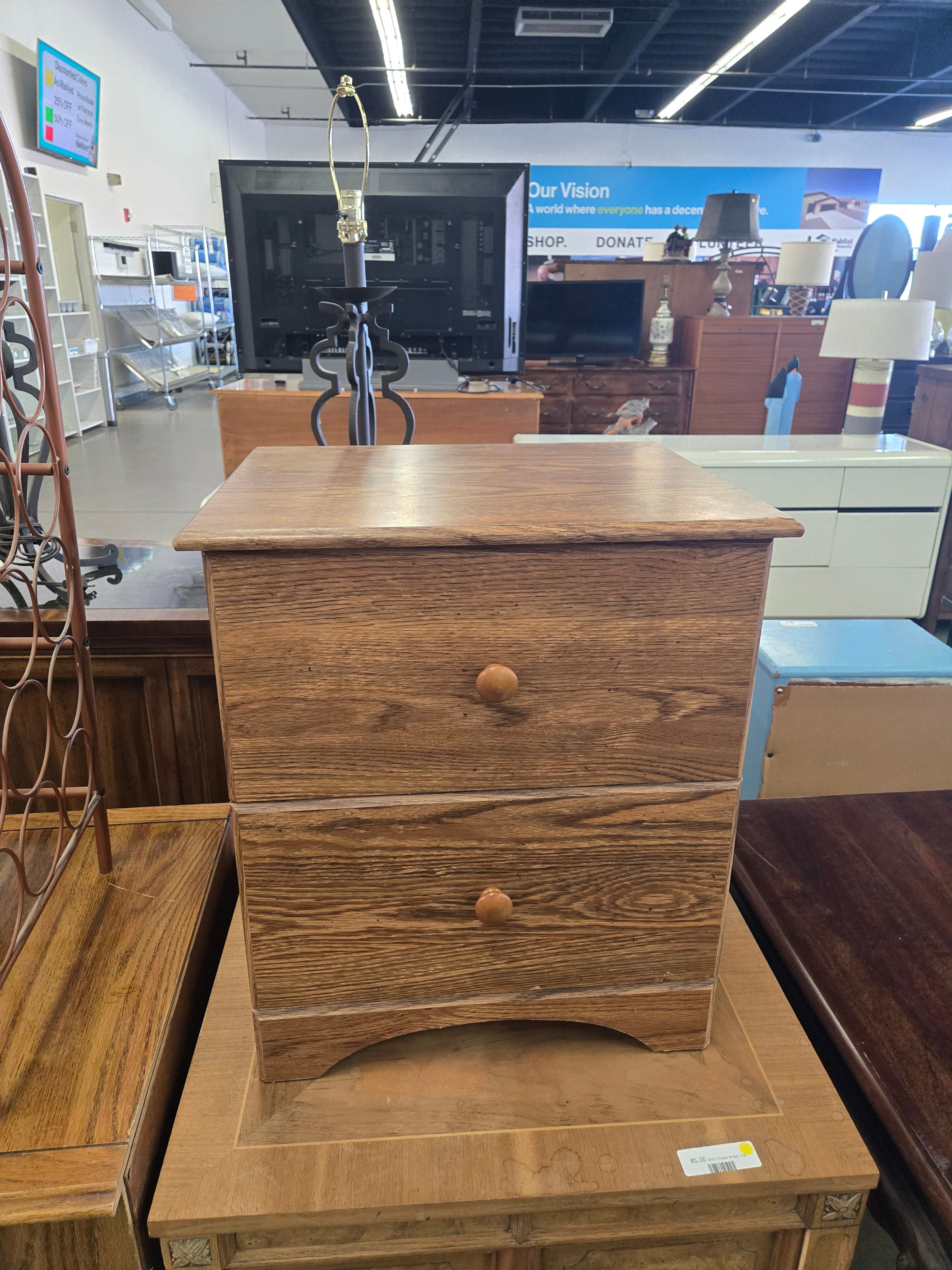 This charming nightstand features a classic oak finish with a smooth surface and rounded wooden knobs. Perfect for adding a rustic touch to any bedroom décor. Approximate Size: 2.5 x 2 x 1.5