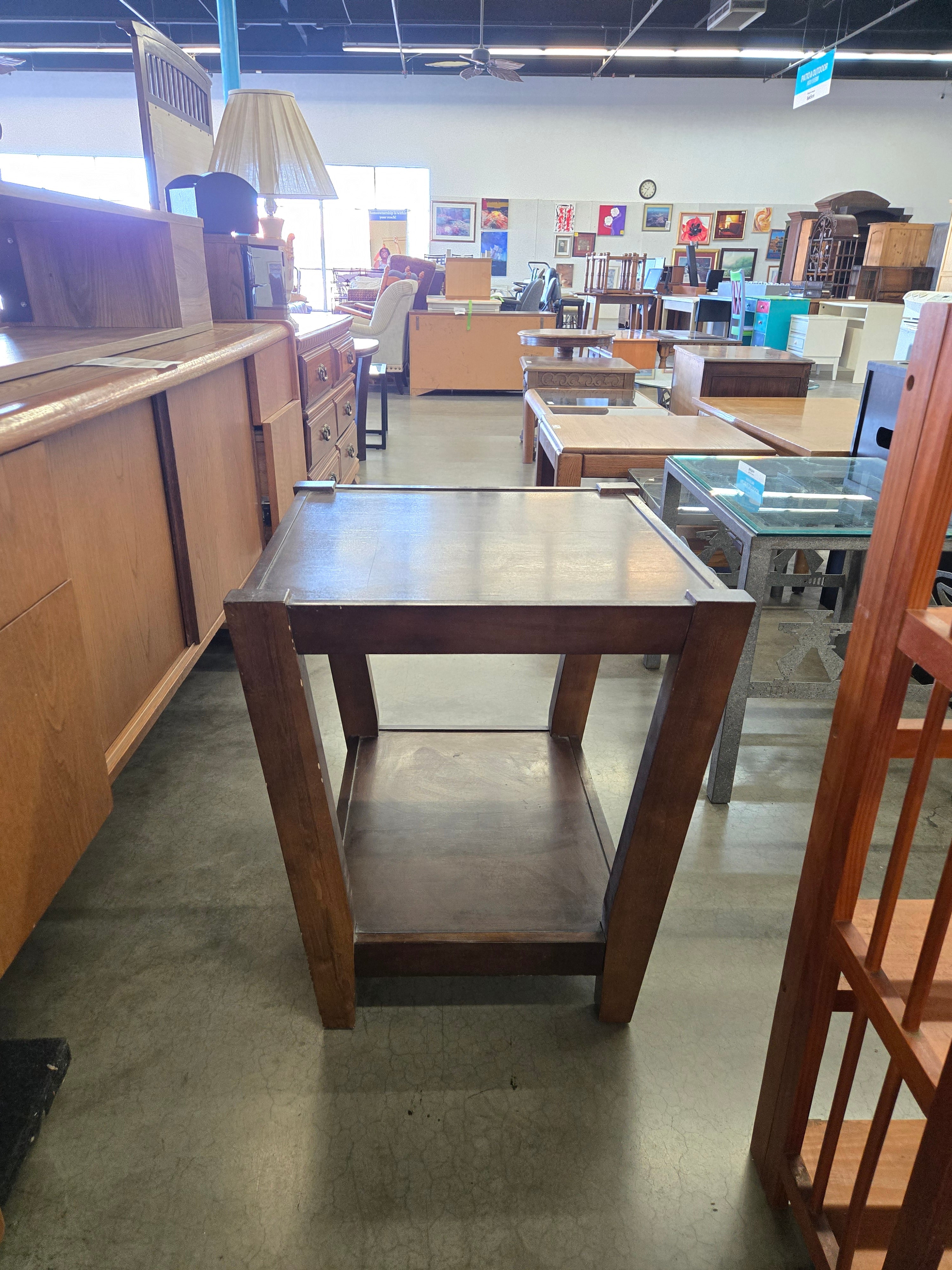 This vintage side table features a rich brown finish and a sturdy wooden construction. The table includes a lower shelf for additional storage, making it a perfect fit for any living room setting. Approximate Size: 2 x 1.5 x 1.5
