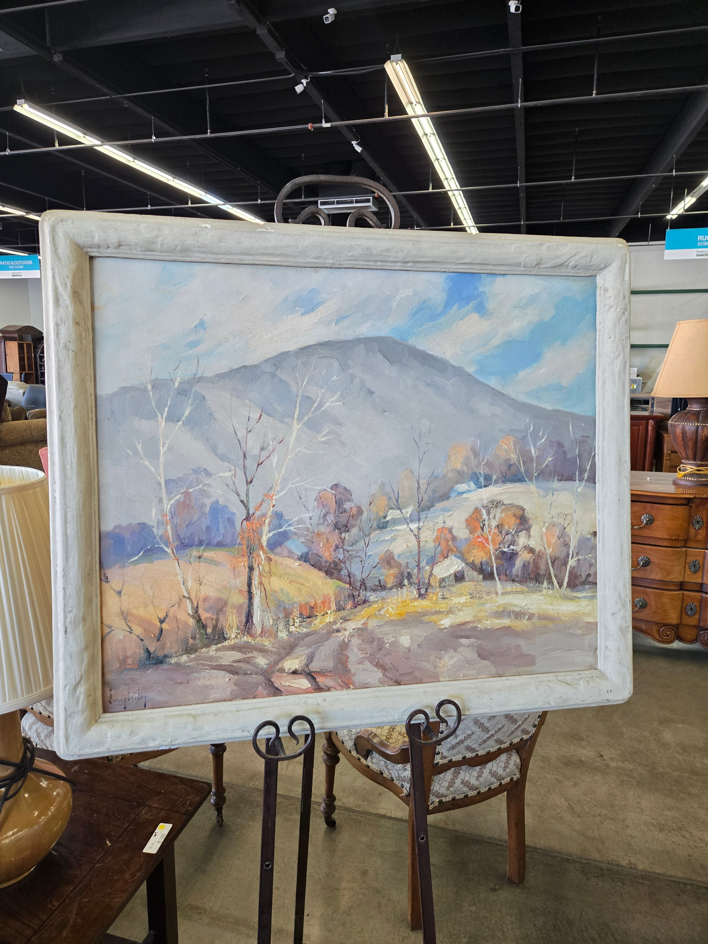Beautiful landscape painting depicting a serene mountain view in autumn colors. The painting is framed in a sturdy, distressed white wooden frame that complements its natural tones. Approximate Size: 3 x 4 x 0.1