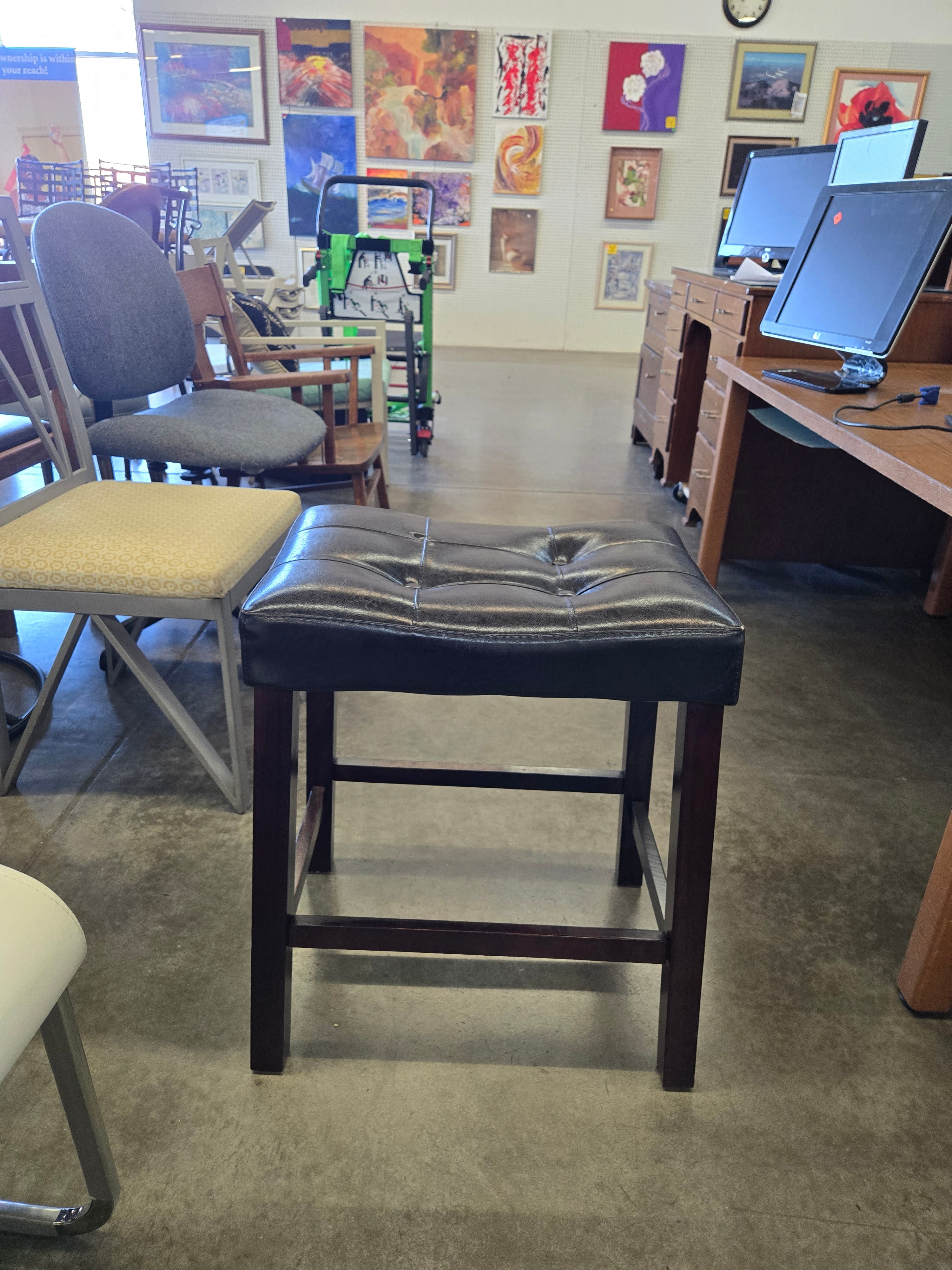 This bar stool features a sleek black faux leather upholstery with a tufted finish, paired with sturdy dark wood legs. Perfect for adding a modern touch to your home bar or kitchen counter. Approximate Size: 2.5 x 1.3 x 1.3