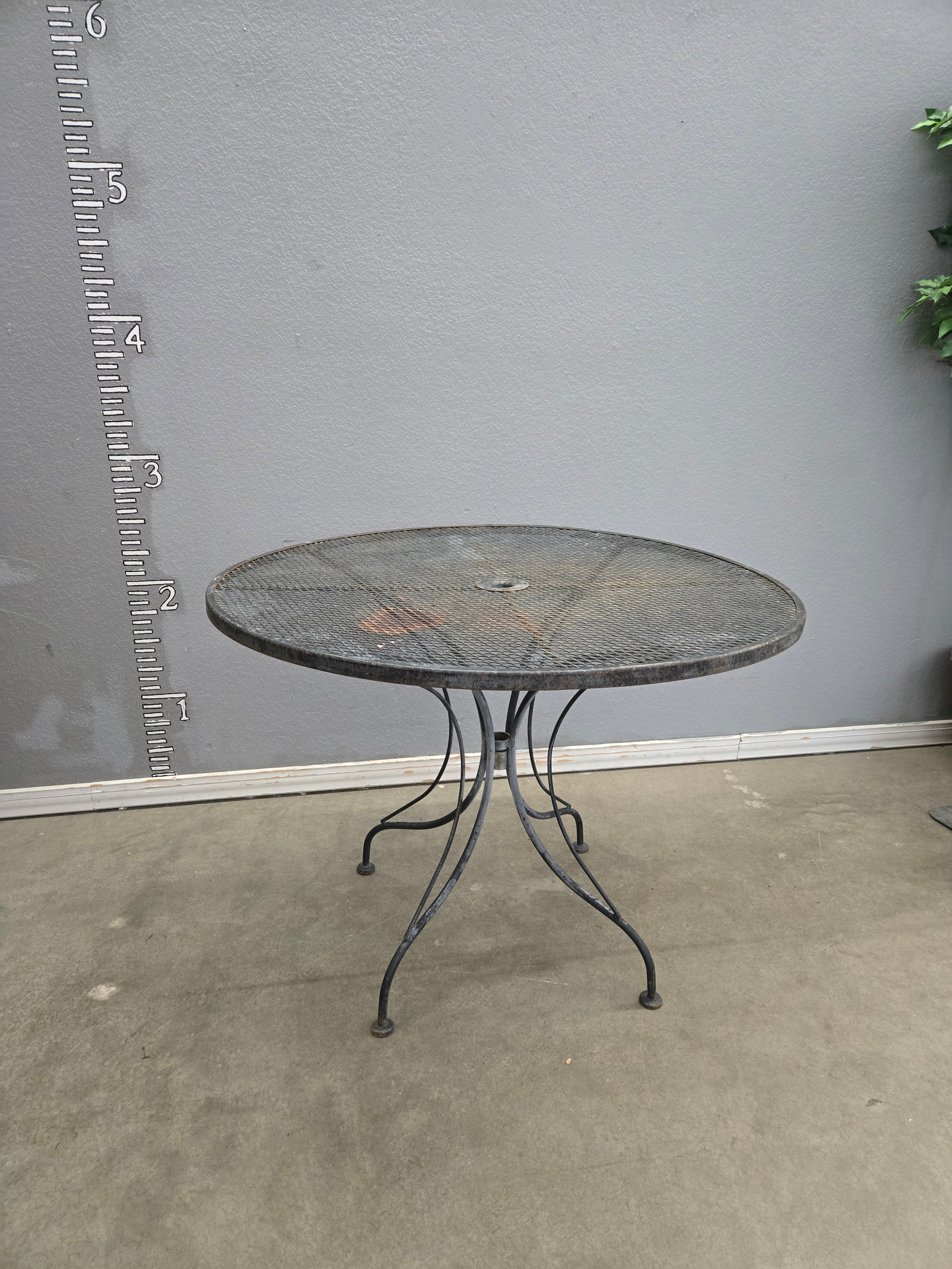 This is a sturdy, round metal patio table with a black weathered finish. The table's design features an elegant curved leg structure, perfect for outdoor dining or display in your patio area. Approximate Size: 3 x 3 x 3