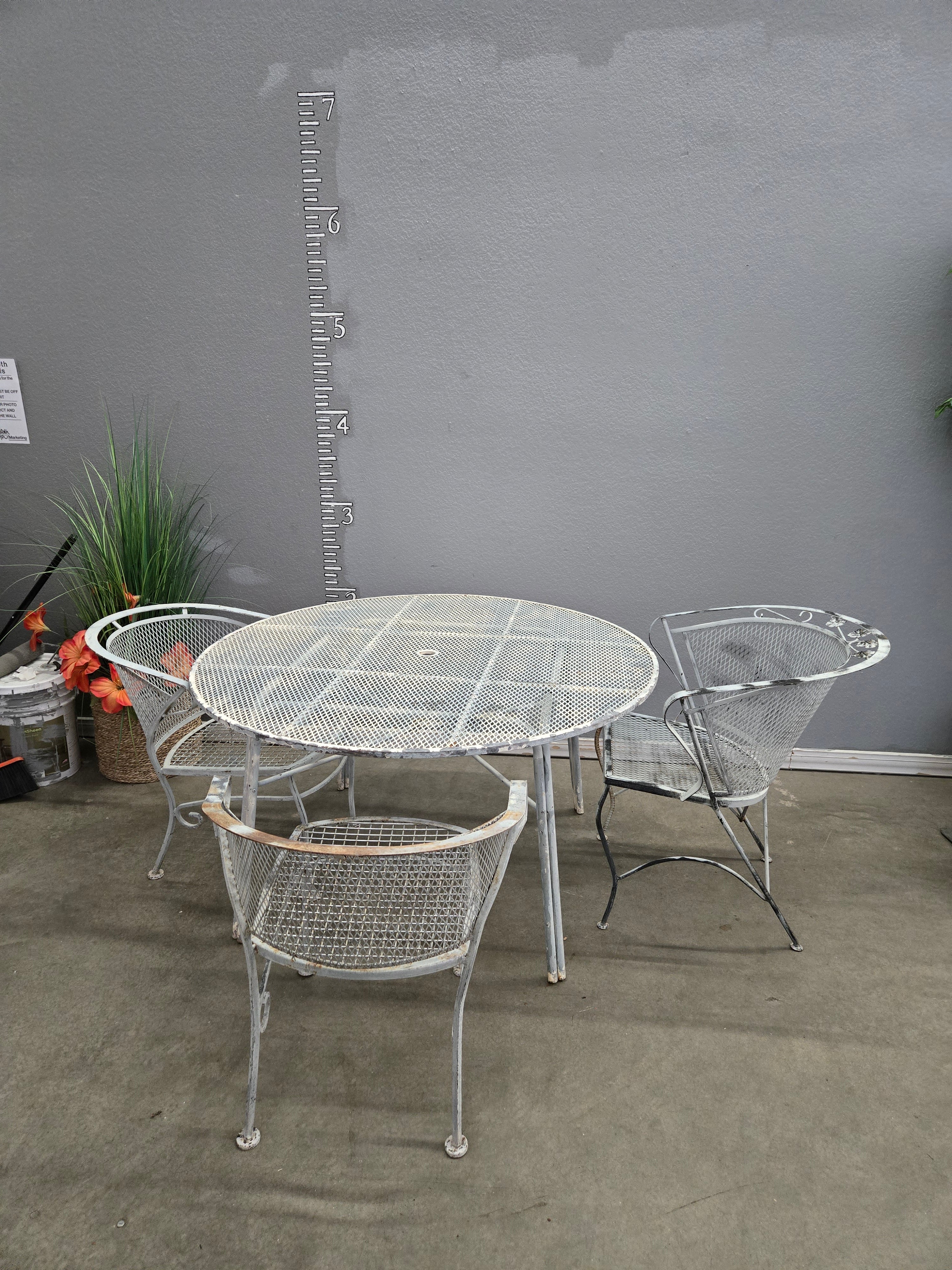 This charming vintage patio dining set features a durable metal construction with a weathered gray finish. The set includes a round table and four matching chairs, perfect for outdoor gatherings. Approximate Size: 2.5 x 4 x 4