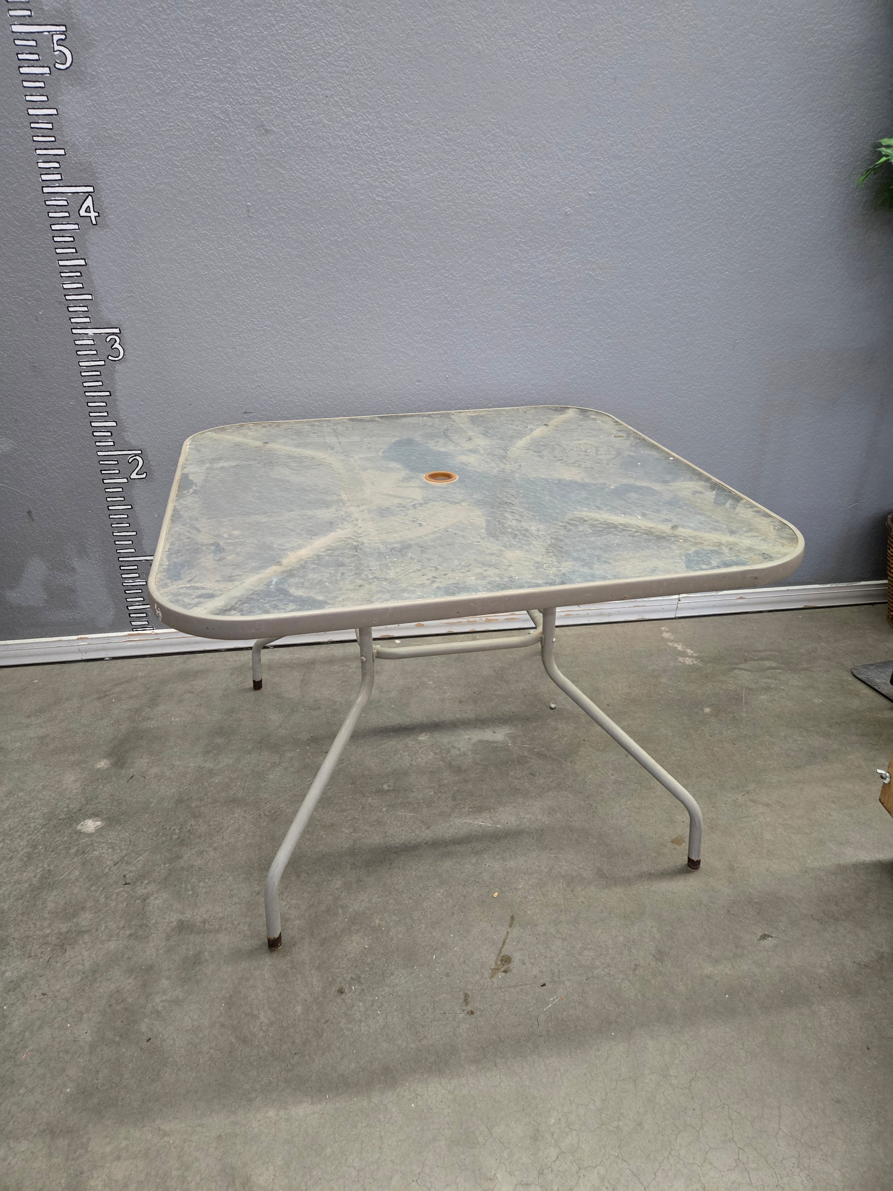 This outdoor patio table features a sturdy metal frame with a glass top. The frame is finished in a neutral beige color, providing a rustic look suitable for any patio or garden setting. Approximate Size: 2.5 x 3 x 3
