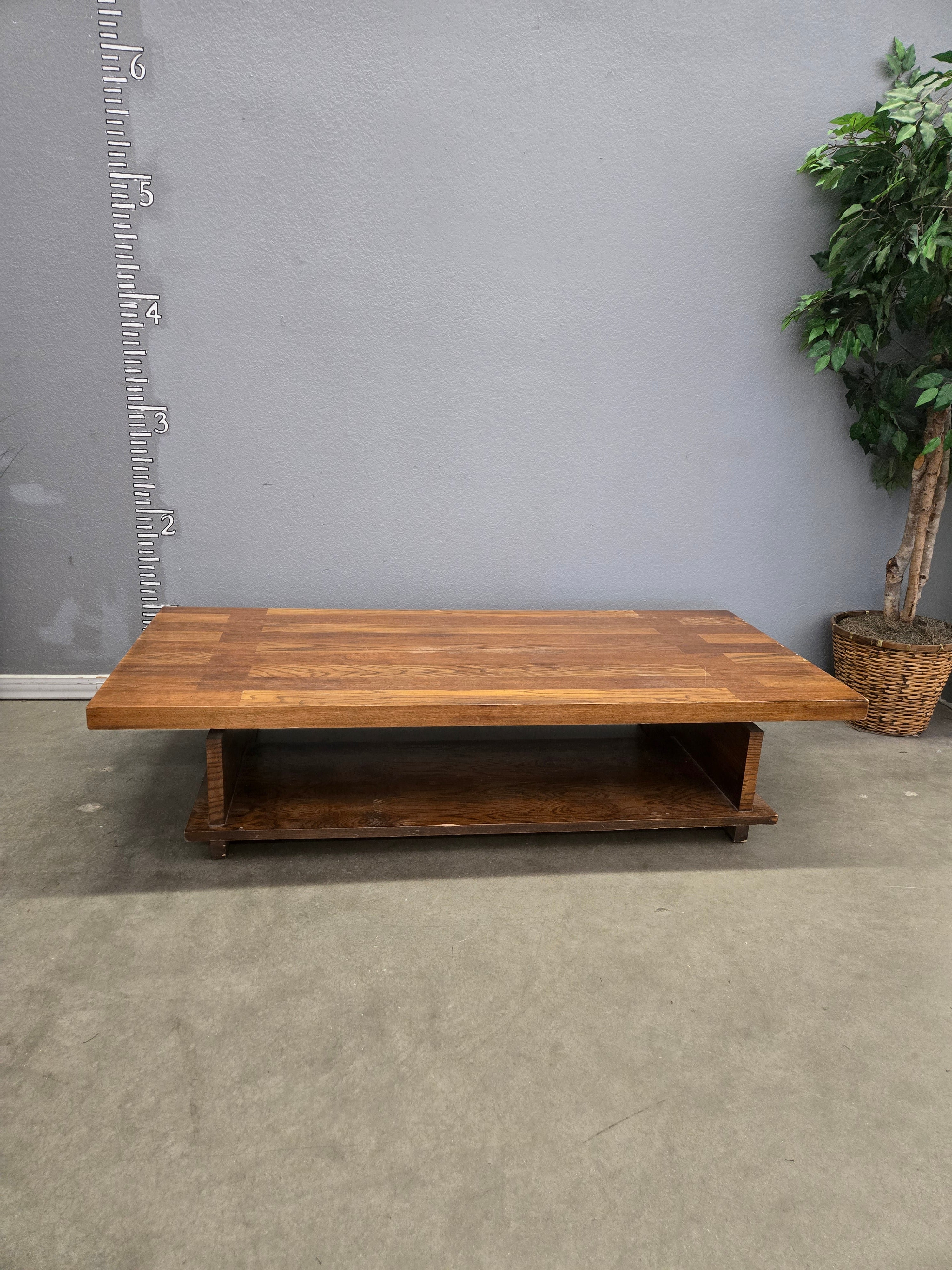 This sturdy coffee table features a rich brown finish with a smooth wood surface. Equipped with a convenient lower shelf for additional storage or decor display. Approximate Size: 1.5 x 4 x 2