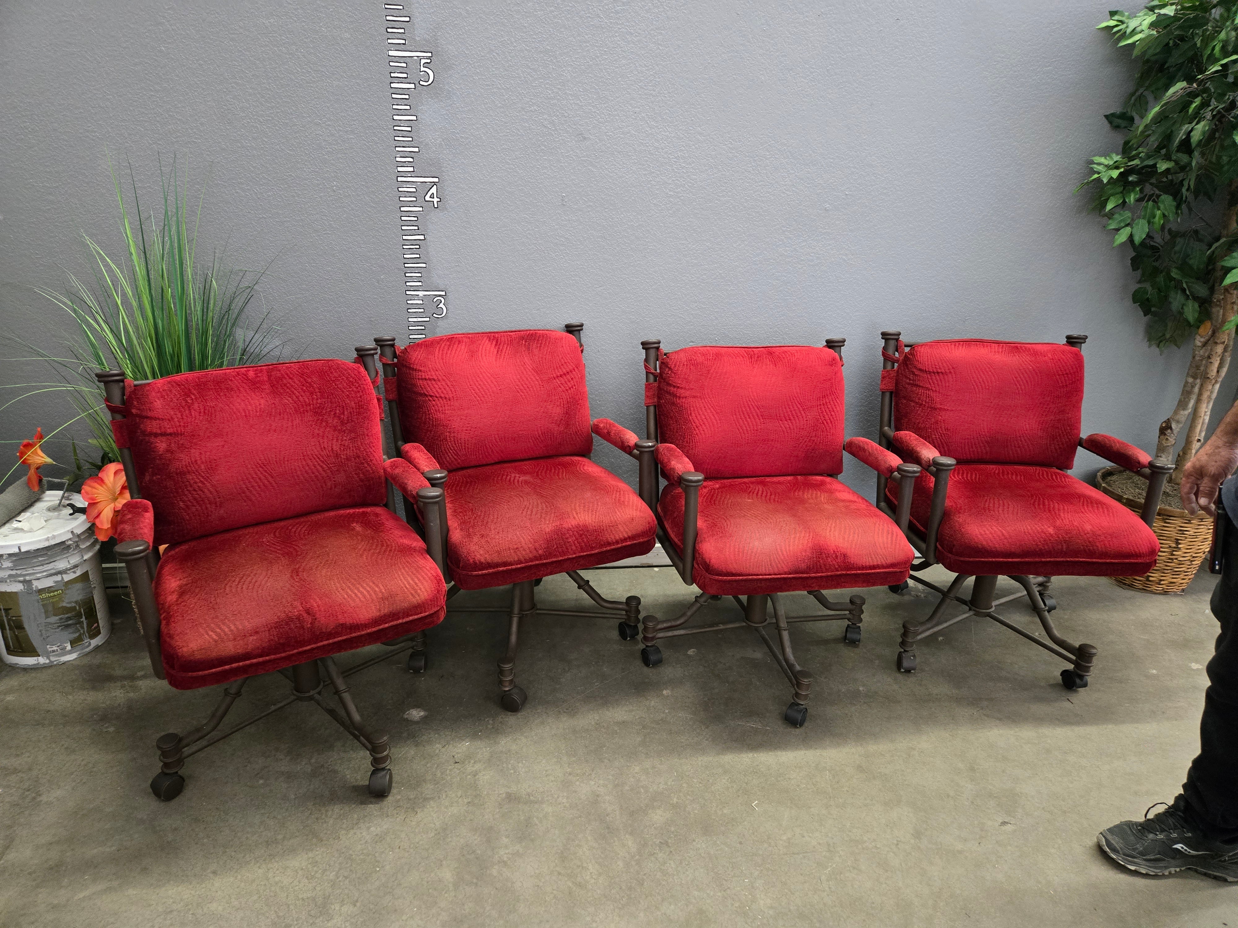 This set of four vintage dining chairs features a striking red fabric with a plush, velvety finish. Each chair is equipped with a sturdy metal base, offering both durability and style for your dining room. Approximate Size: 3 x 2 x 2