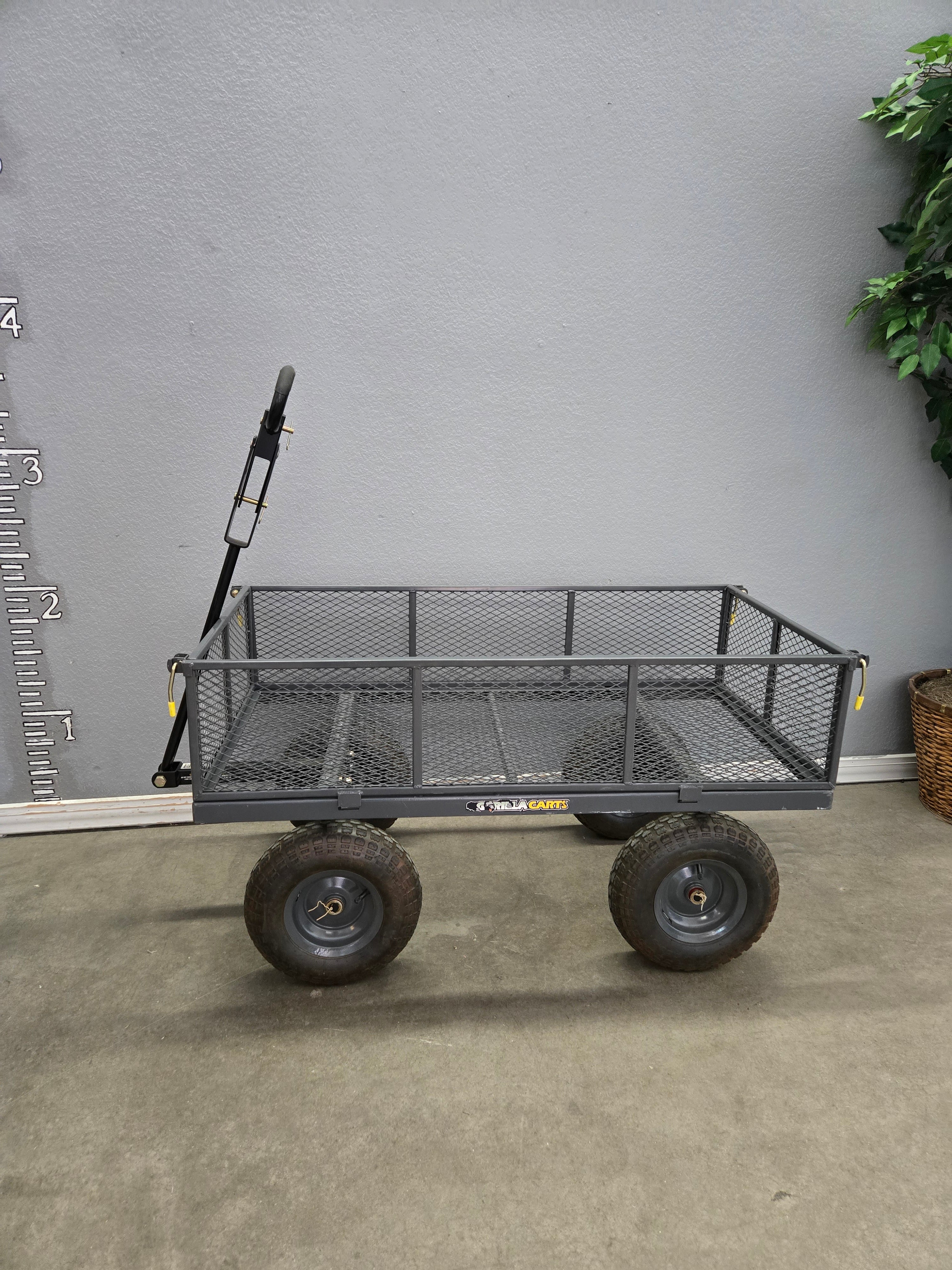 Durable steel garden cart in black with a powder-coated finish, featuring a mesh bed and pneumatic tires for easy handling. Approximate Size: 2 x 4 x 2