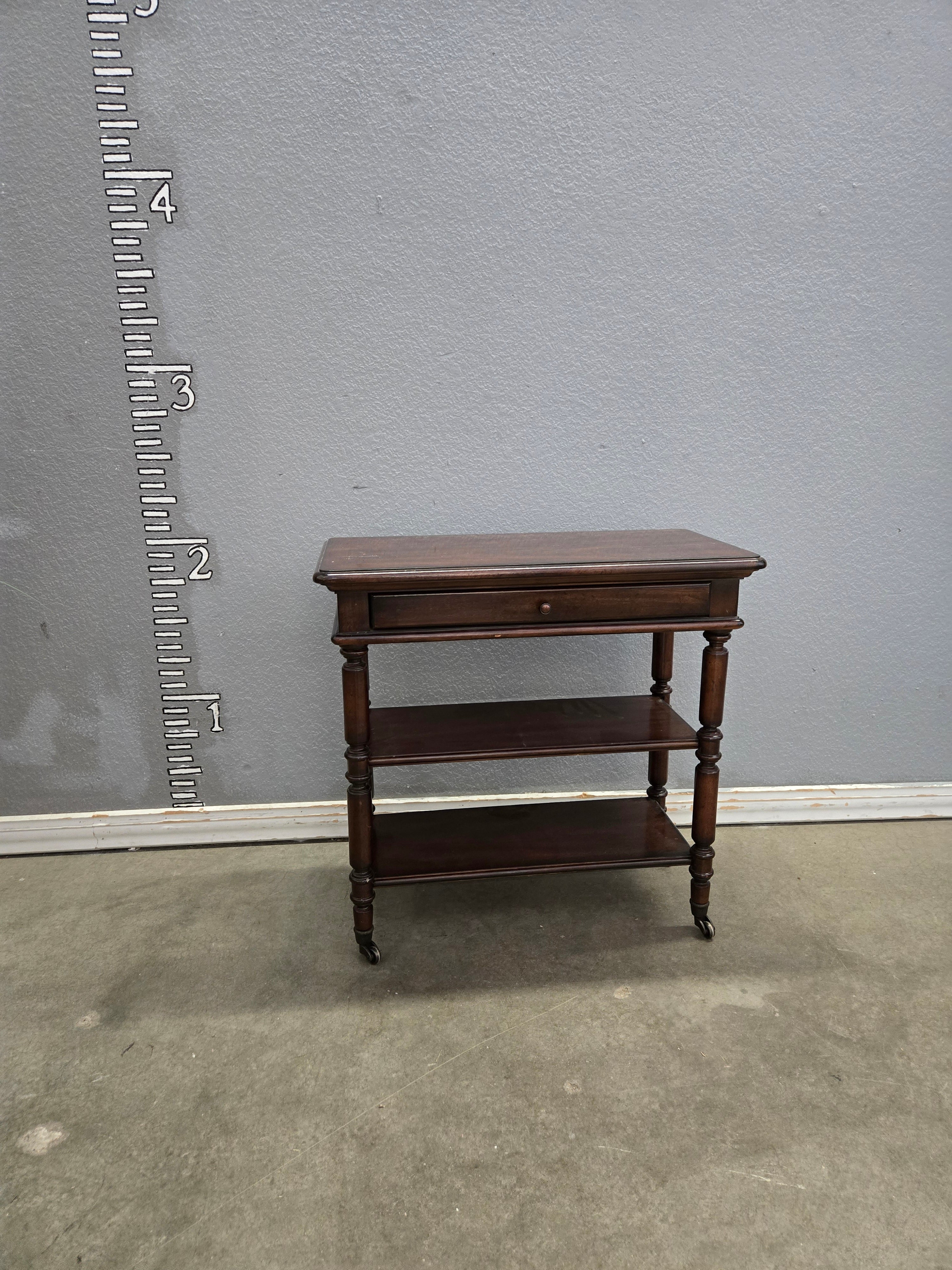 A classic vintage side table featuring a rich brown finish. The wooden table includes a single drawer and two lower shelves, perfect for storage and display. Approximate Size: 4 x 2 x 1.5
