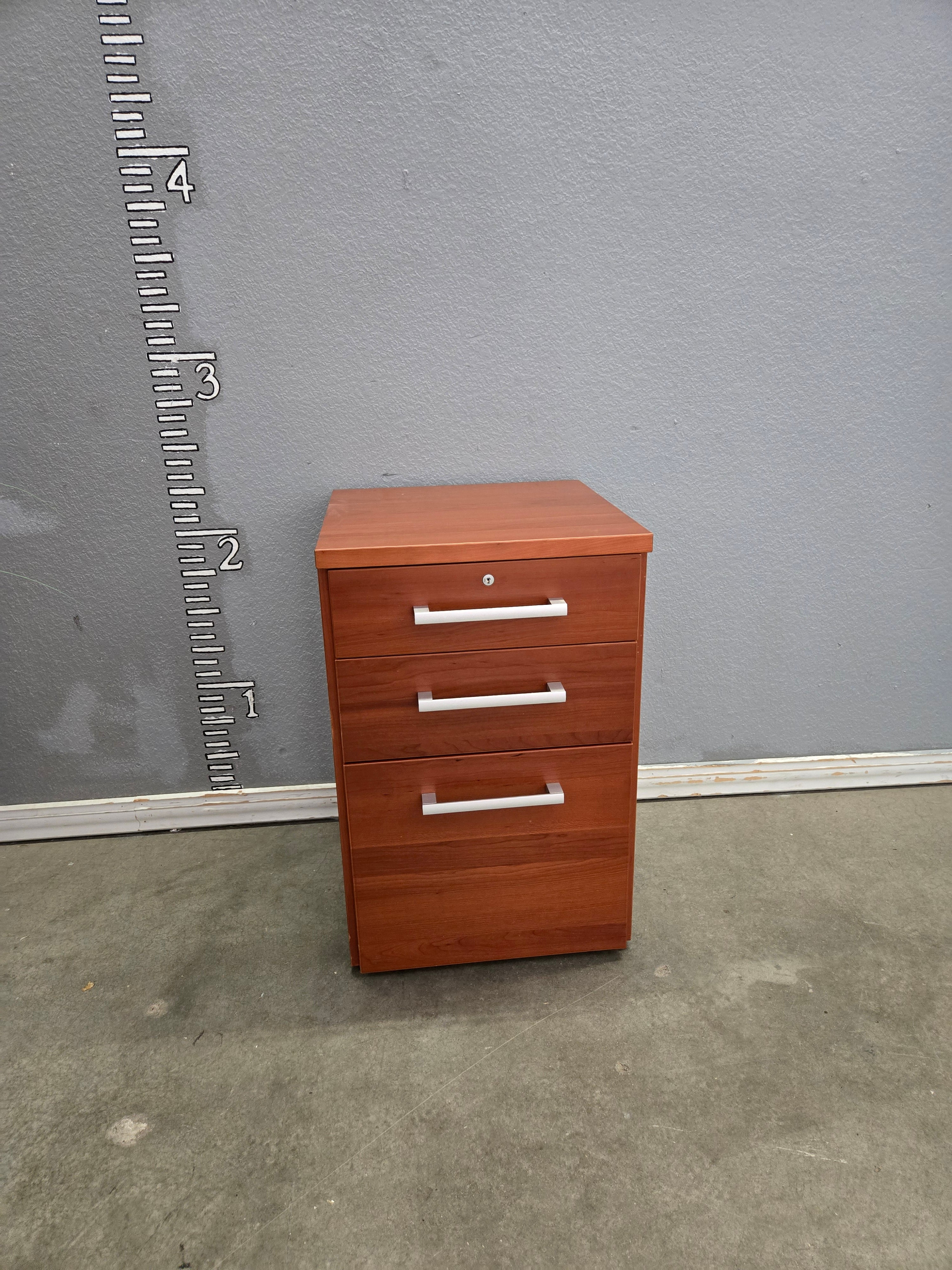 This office filing cabinet features a sleek, cherry wood finish with metal handles, offering a stylish and functional addition to any office space. It includes three spacious drawers for ample storage. Approximate Size: 2.5 x 1.5 x 2