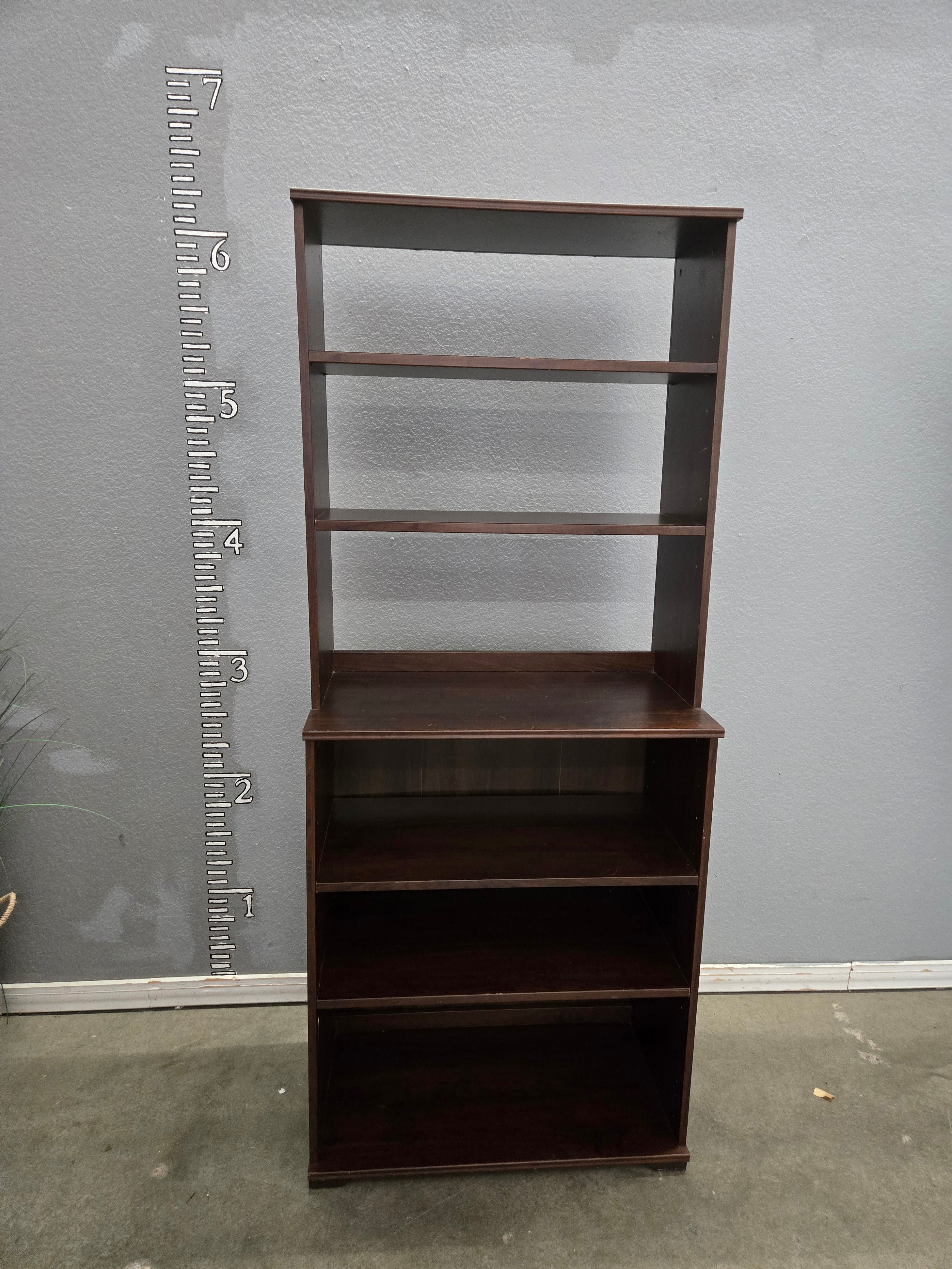 A dark brown wooden bookshelf featuring a smooth finish. This tall unit includes multiple adjustable shelves, perfect for organizing books, decor, or office supplies. Approximate Size: 6 x 2.5 x 1